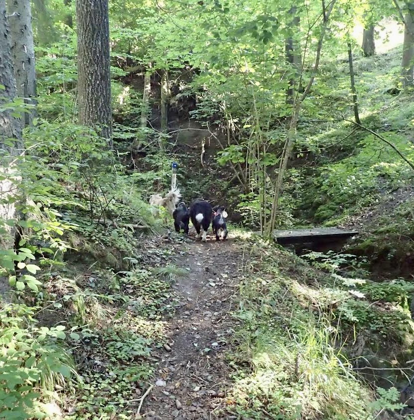 På väg genom ravinen. Troy och Basse har kutat upp och ner efter ravinens sidor om och om igen. Det tar på krafterna med en sådan backträning så till slut går vi alla fyra i samlad tropp mot sjön.