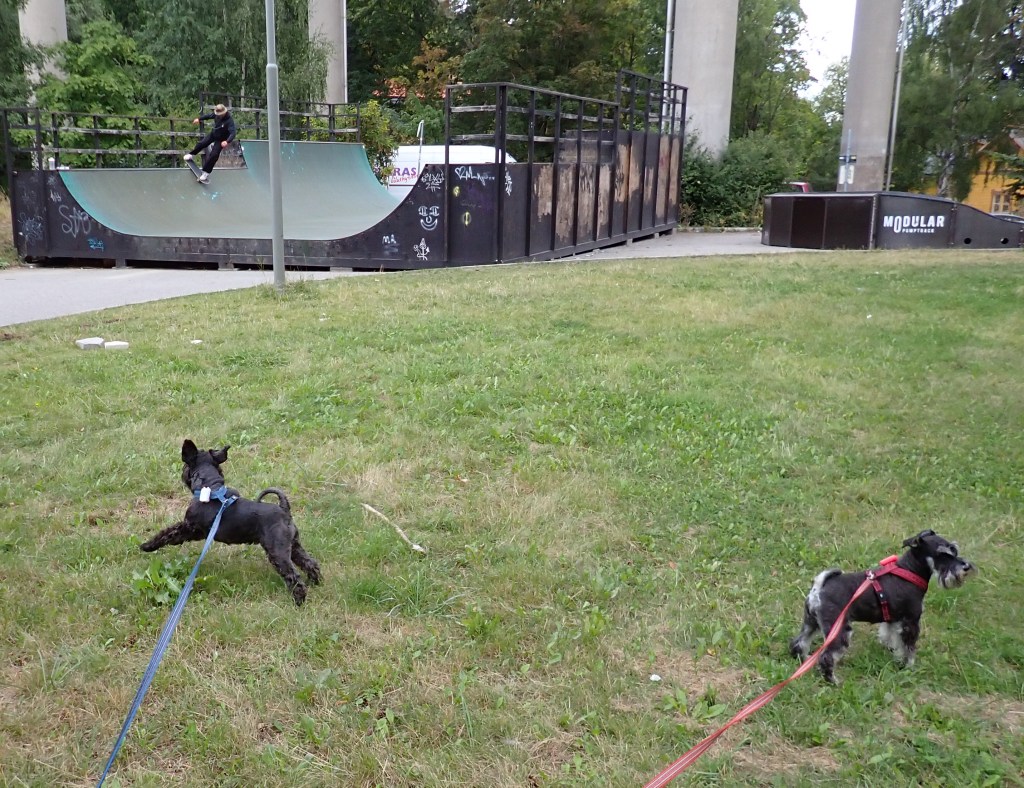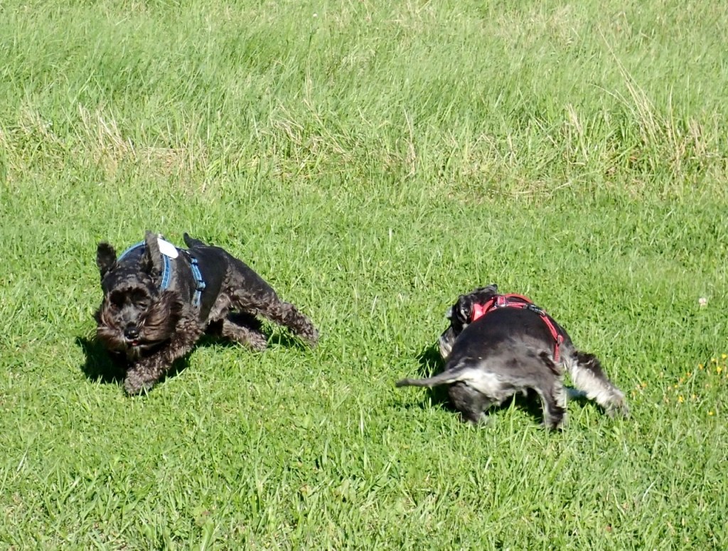 Äntligen tillbaka i husvagnen. Vi gick till en stor äng som ligger på andra sidan om spårvagnsspåren och där fick vi vara på fria tassar. Där körde vi igång vårt snuzzefnatt. Troy är attans så snabb på raksträcka så jag får genskjuta honom för jag är bäst på tvära vändningar