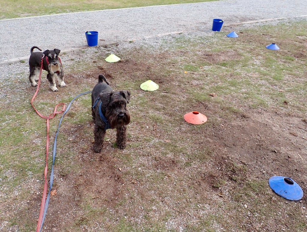 Nere i Vinterviken hade någon lagt ut små låga koner på marken. Matte tyckte att det var perfekt för att träna på att gå slalom.