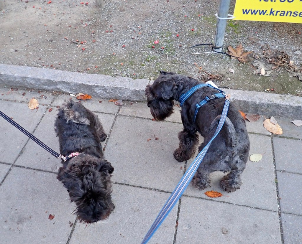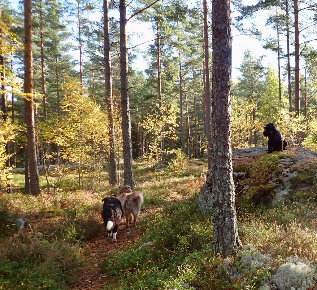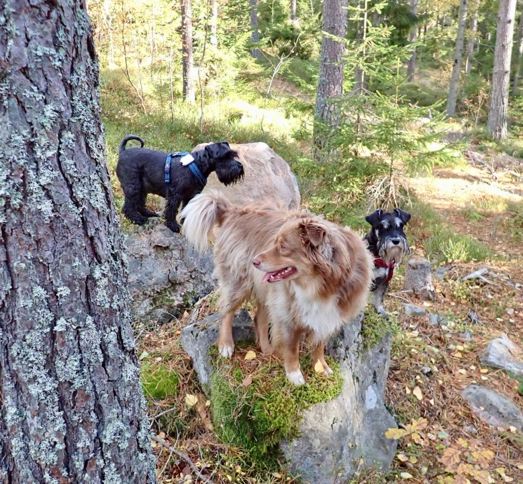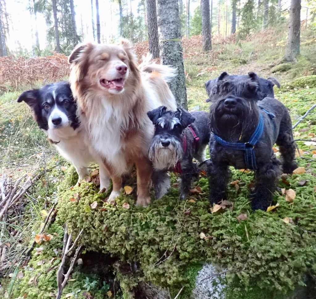 Så började H&M packa lite i en kasse. Skall vi åka till vagnen? Jaa….. det ska vi och dagen efter träffade vi våra bästa vänner Wilma och Basse. Vi fick kuta runt på fria tassar och så ställde vi oss på en Sten för att göra ett gemensams anspråk på tubosten. Matte tog fram kamera och tog bilden på alla fyra som står bredvid varandra och tittar åt samma håll.