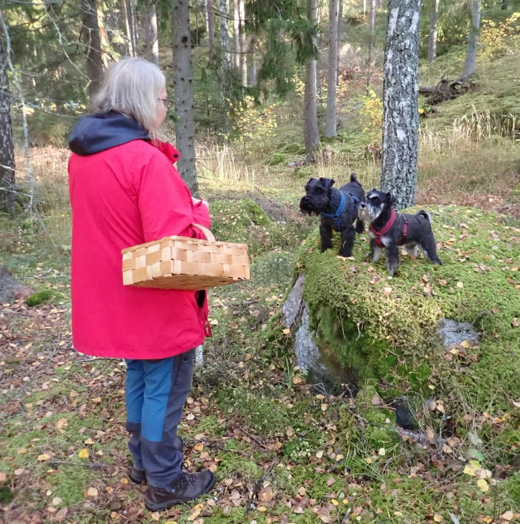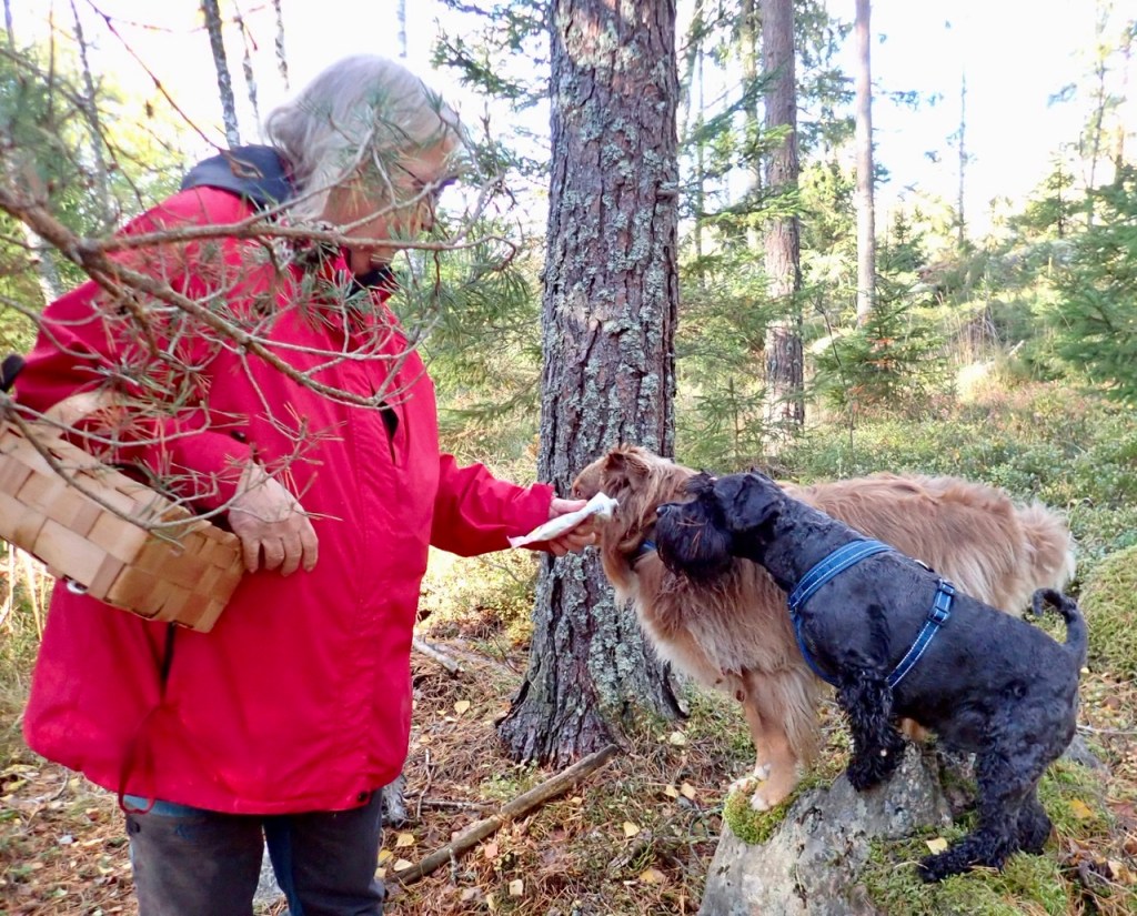 Matte!? Är det här bra svampar? Ja vännen säger hon det är trattkantareller och dem vill jag gärna ha. Vi hittar rätt många på vår väg genom skogen. Några få taggsvampar fann vi också. Troy försökte sig på sitt markera svamp i mattes korg men det lönar sig inte.