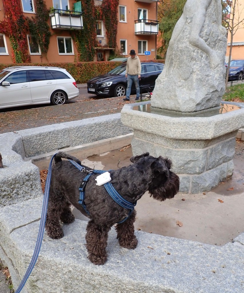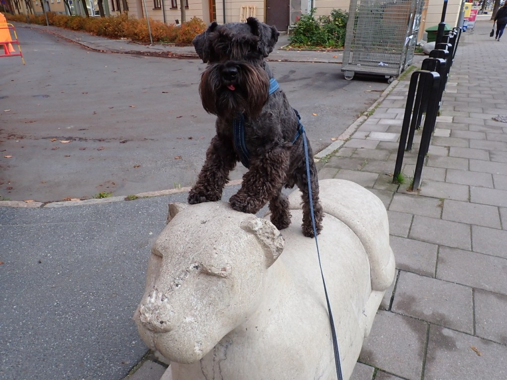 Alltså jag gillar inte fula stengubbar eller betonglejon, morrade hotfullt på den. Troy tycker jag är lite fånig och hoppar upp på lejonryggen. Jag fortsätter mitt varningsmorr.