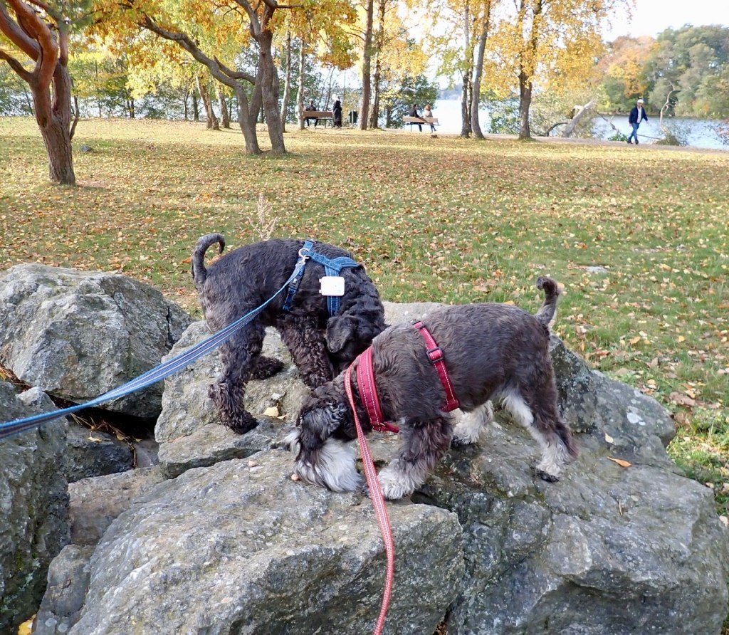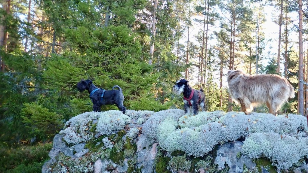 Promenaden gick ut till Rävudden där det finns några högar med stora stenar. Matte strödde ut en massa godis på dem och sen fick vi hoppa upp för att städa upp. Inte en endaste liten smula blev kvar.