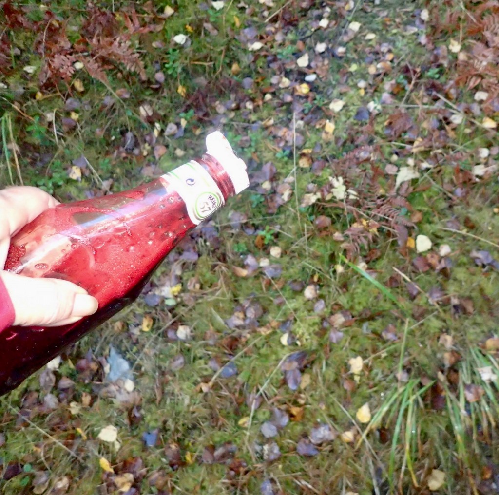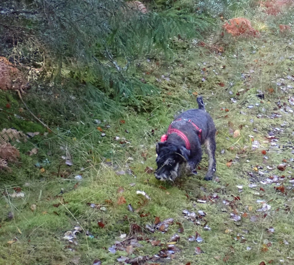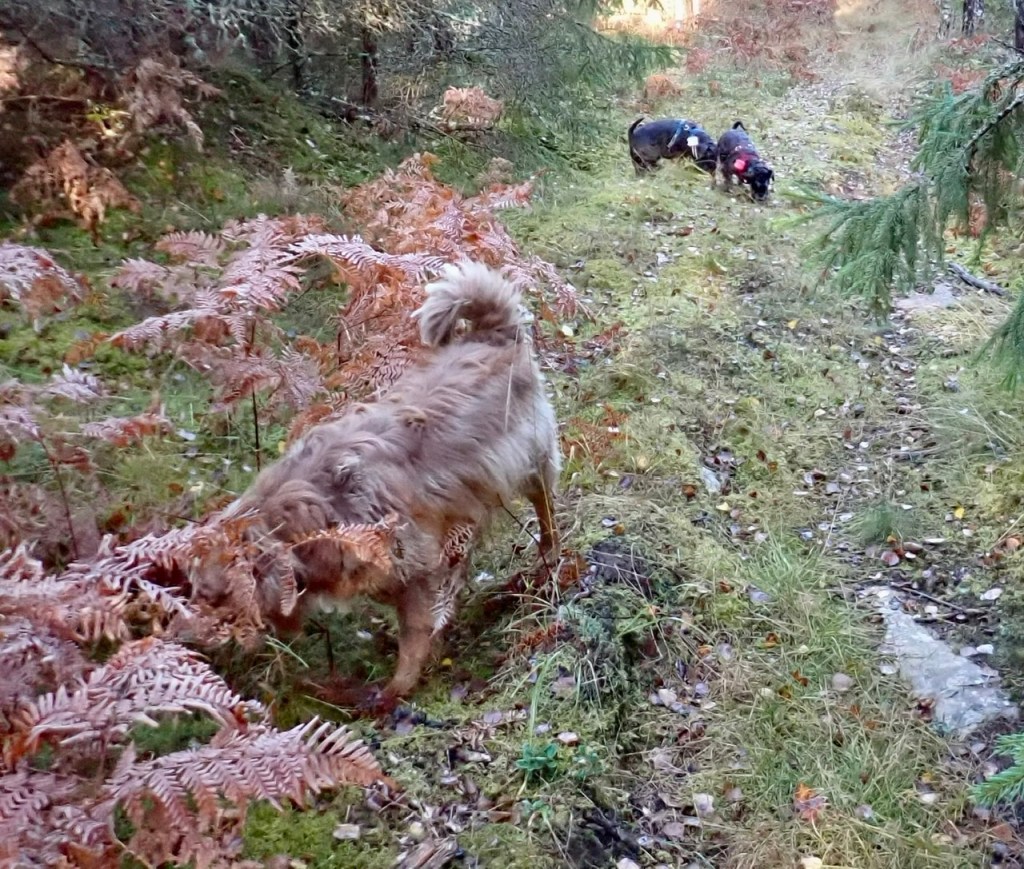 Troy kollade av Helenas korg och berättade för oss att där finns det minsann både nötblod och köttbullar. Då vet vi vad som är på G. Helena försvann och droppade på sin väg genom snåren små små fläckar med blod. De blir som doftfyrar för oss och vi är duktiga på att följa spåret.
