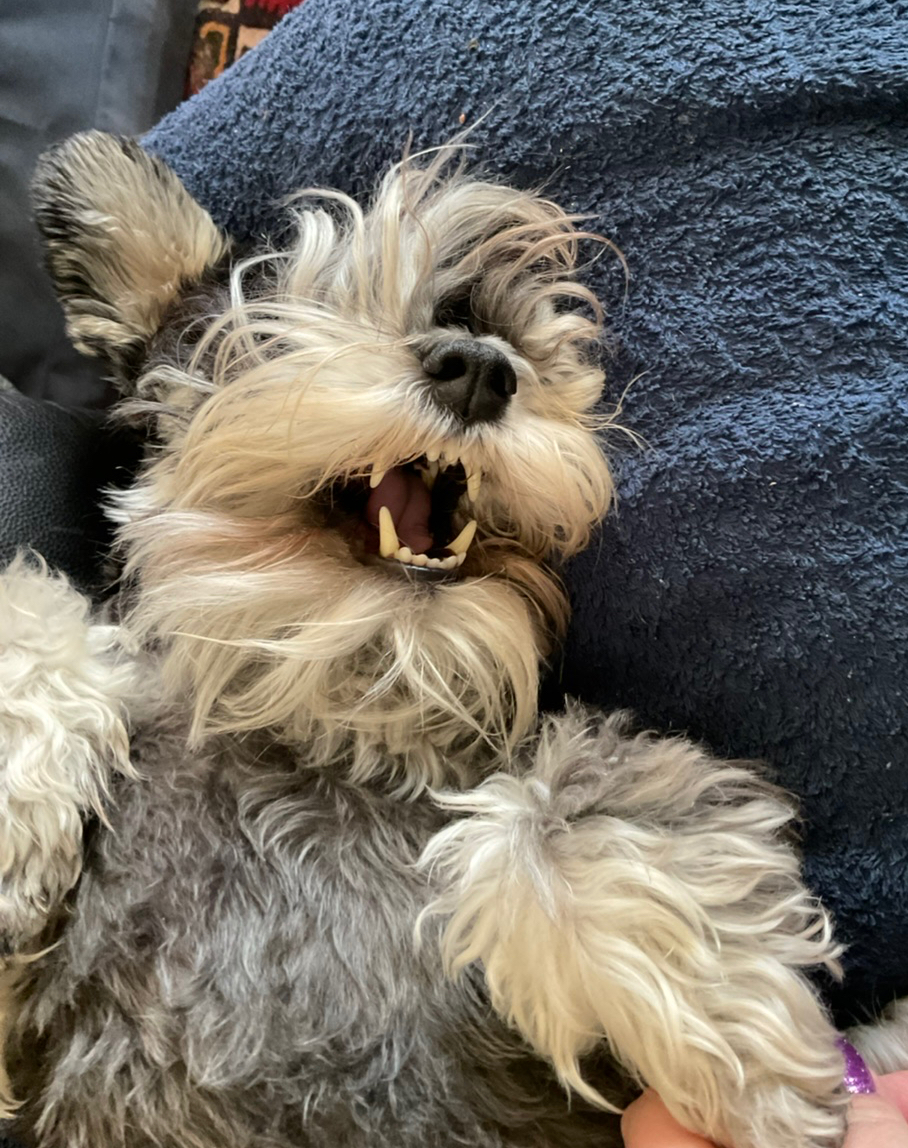 Först gosar vi sen retas matte lite med mig och då tar jag fram min farliga gremlinsmin. Matte bara skrattar och killar mig på magen vilket sätt va! Ni ser väl att jag är jättefarlig, ja jag är ju rent av livsfarlig.