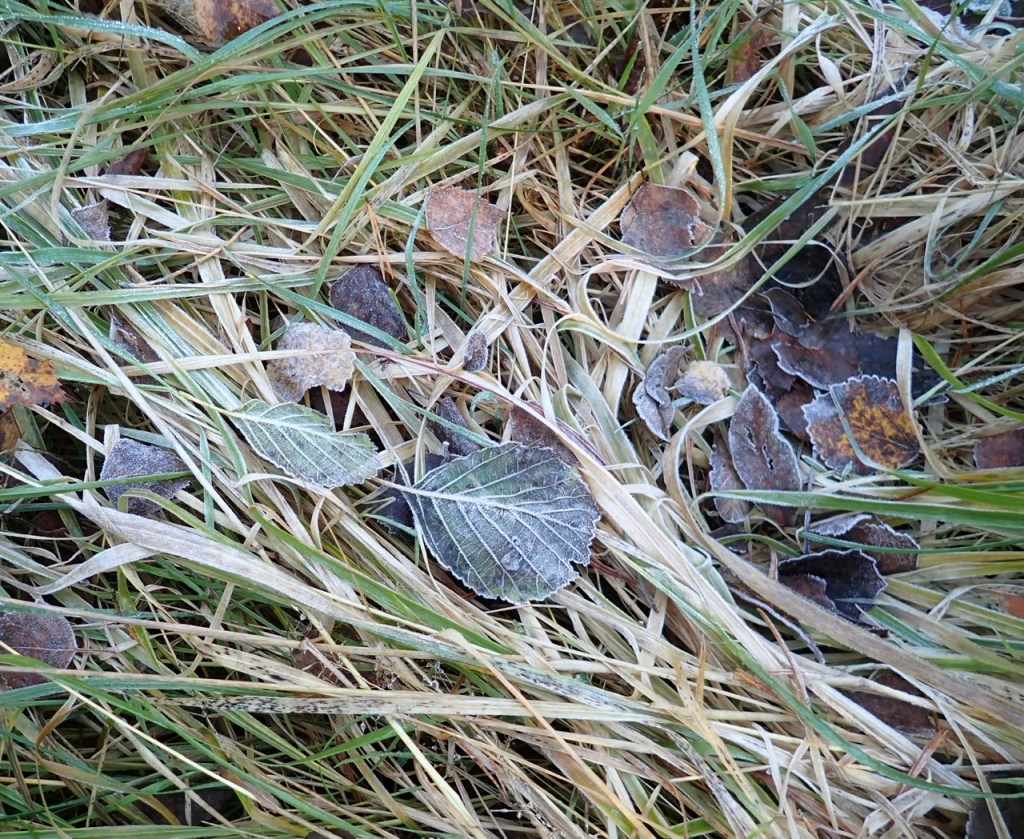 Matte får för sig att ta en bild av frostnupna löv. Inget som intresserar oss fyrbeningar men hon tycker att de är vackra.