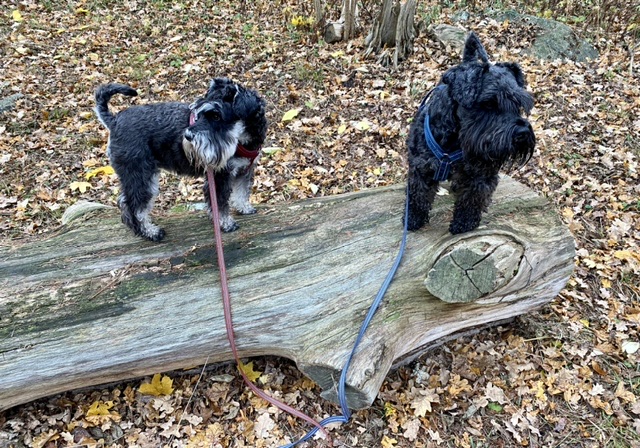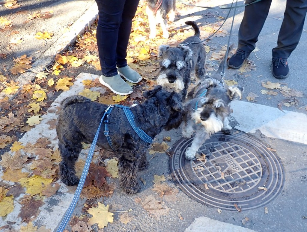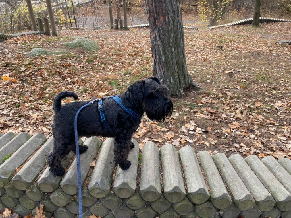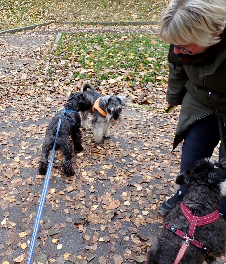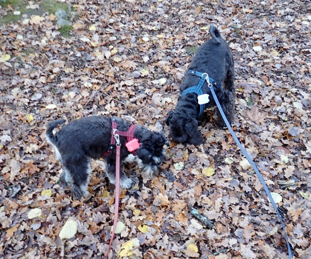 På söndagspromenaden var det många ute och gick i det fina vädret. Vi träffade tre peppar och salt snuzzar. Det var herr och fru schnauzer med sin son. Vi hälsade ivrigt på varandra, det var väldigt trevligt. Tvåbeningarna pratade en massa tråk som vi tycker det är ointressant.