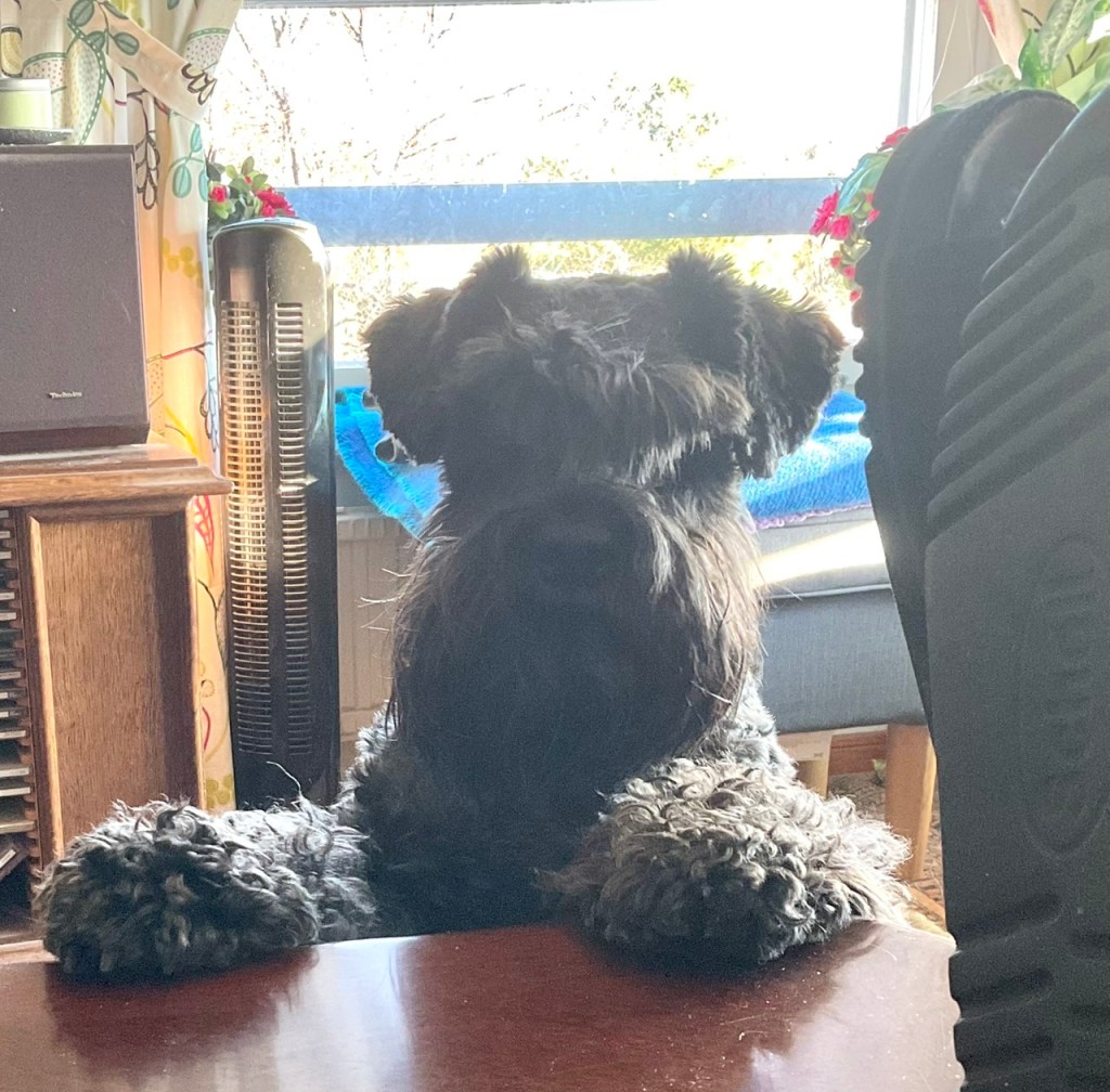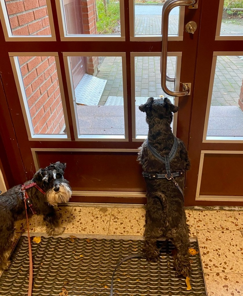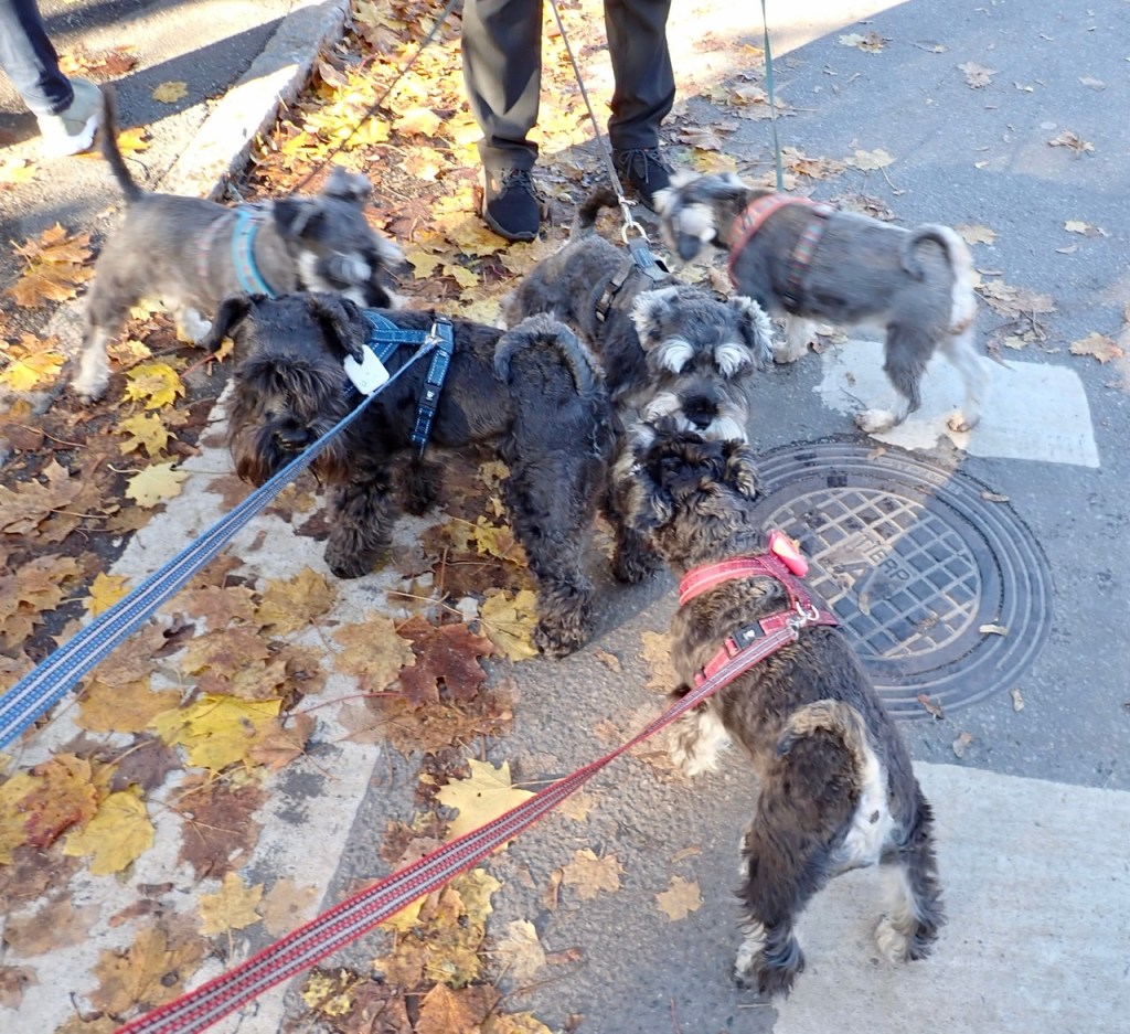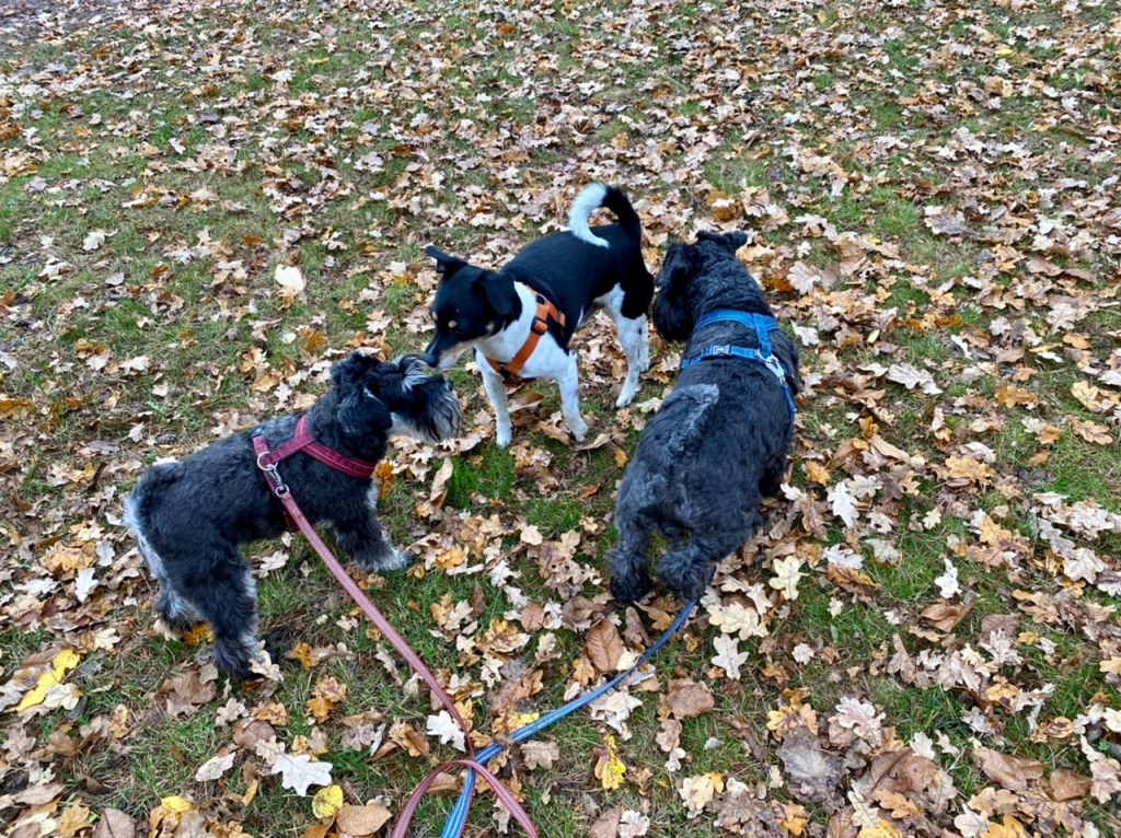 På söndagspromenaden var det många ute och gick i det fina vädret. Vi träffade tre peppar och salt snuzzar. Det var herr och fru schnauzer med sin son. Vi hälsade ivrigt på varandra, det var väldigt trevligt. Tvåbeningarna pratade en massa tråk som vi tycker det är ointressant.