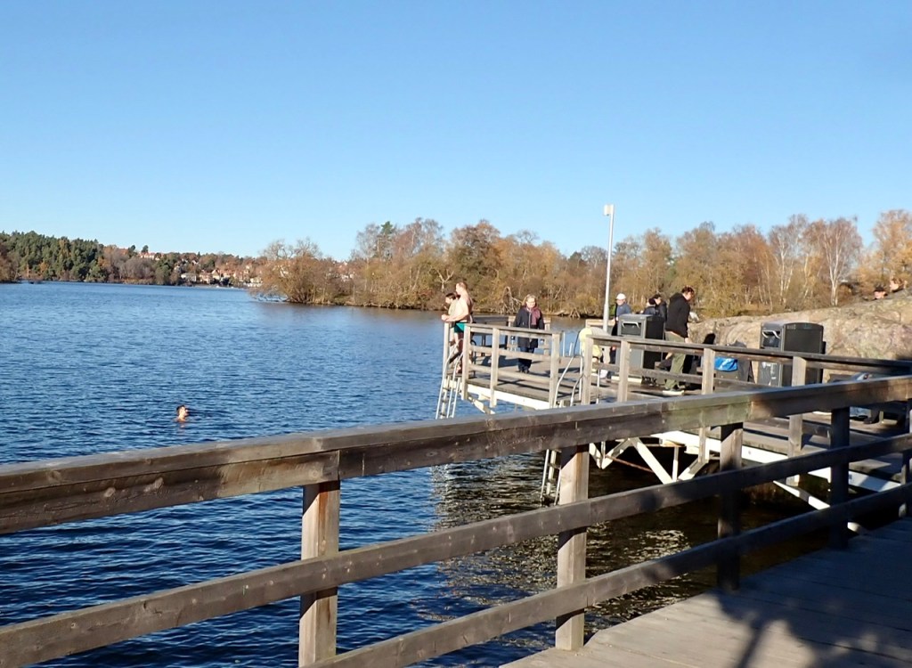 Härlig höstdag sol och några få plusgrader. Det finns många badgalningar på plats vid Sjöberget