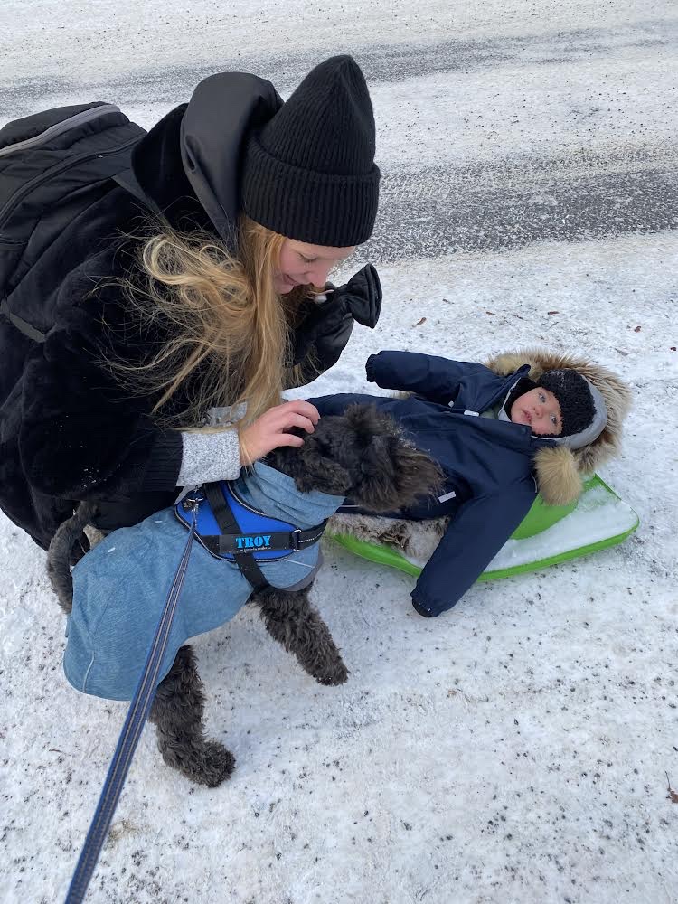 Vi mötte en tjej som hade en liten tös på släp i en pulka. Bebisens mamma sa hej till Troy och han svarade direkt genom att gå fram till henne och stryka sig mot hennes ben, hon satte sig på huk och kliade honom. Försiktigt och sakta närmade han sig bebisen och pussade henne lite. Hon tycker om hundar och skrattade högt av pussen Troy blev alldeles överlycklig och pussade försiktigt igen. Matte sa nu får det räcka nu måste vi gå för det är svinkallt. Bra att hon ingrep för annars hade han stannat kvar och fortsatt pussas hur länge som helst.