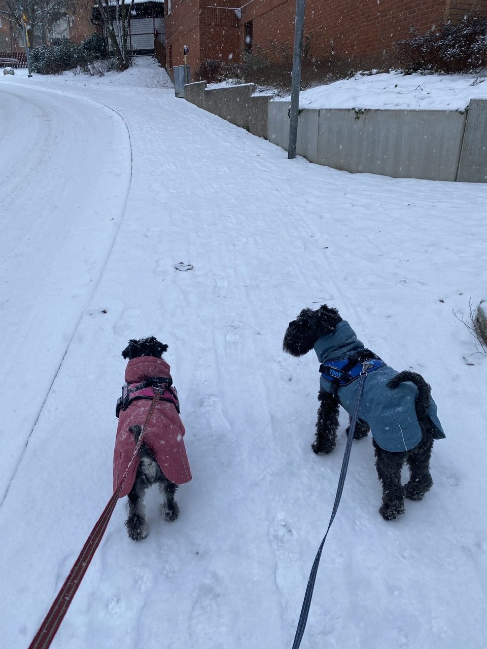 Då kom det snö igen, det är ganska trevligt för det blir ljusare. Men tusan vad kallt det blev -14 grader. Då får även Troy en jacka på sig och långpromenaden blir lite kortare. Det gäller att hålla igång och inte stanna för länge för då börjar man frysa.