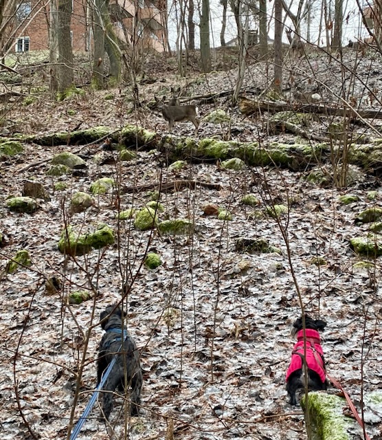 Rådjuren blir bara fler och fler. Inte bryr de sig om att vi gapar loss allt vi kan. De står bara där och glor på oss som om vi inte skulle vara kloka. Vi tystnar efter en stund för matte hyssjar oss och då återgår de till att äta, vad det nu är som de mumsar på
