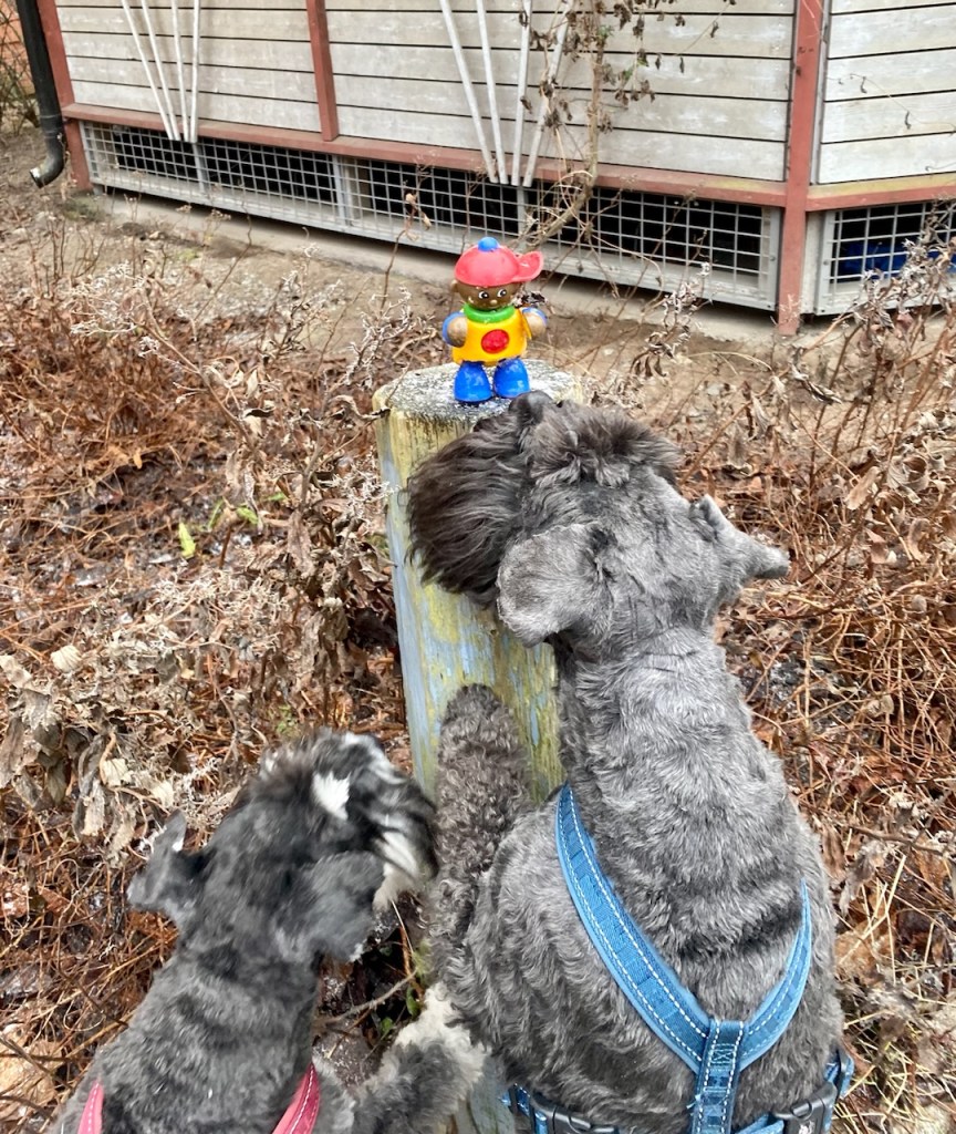 Utanför våran port finns två små stolpar. På den ena stod det en liten färgglad figur som vi måste kolla in.