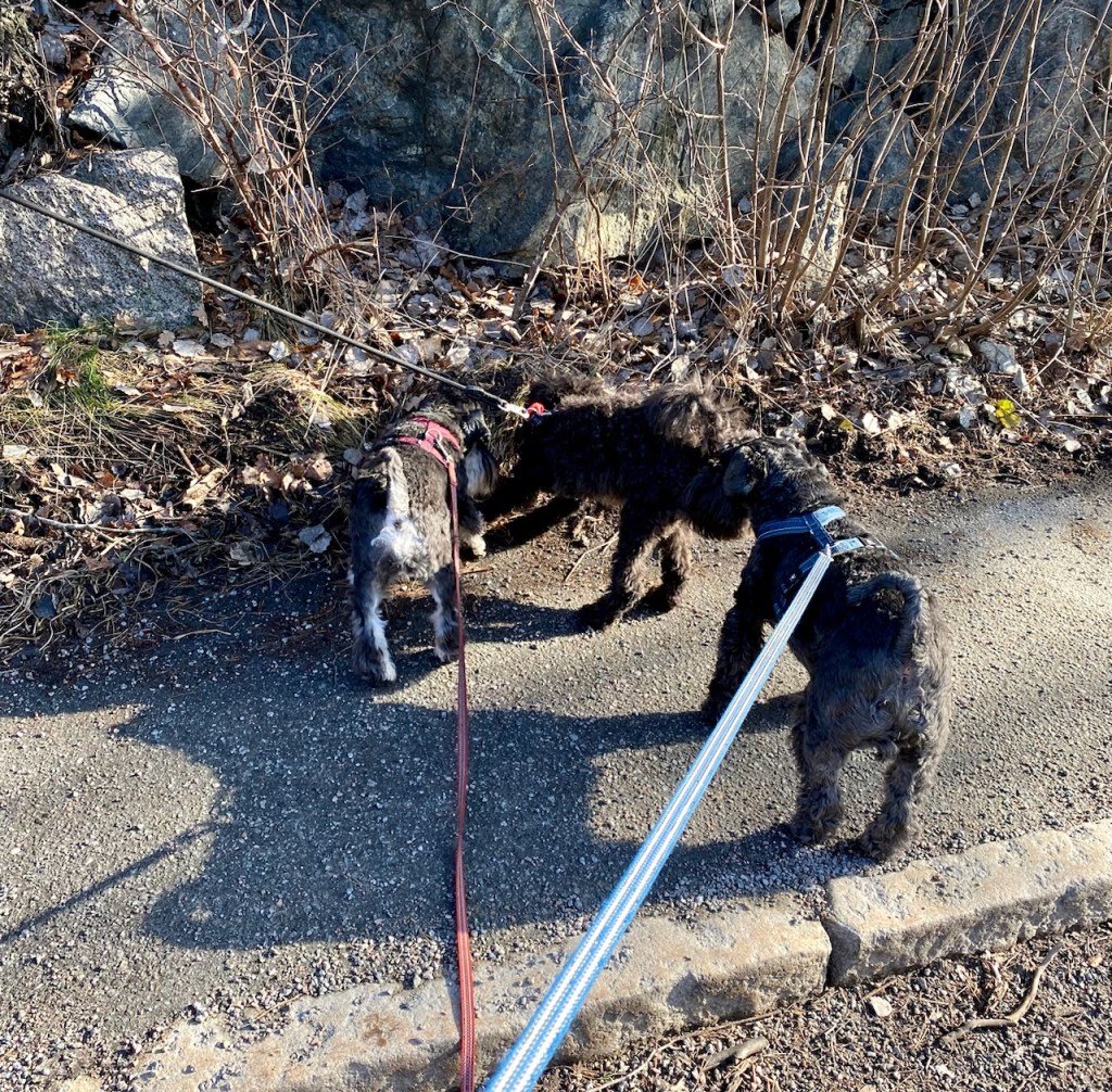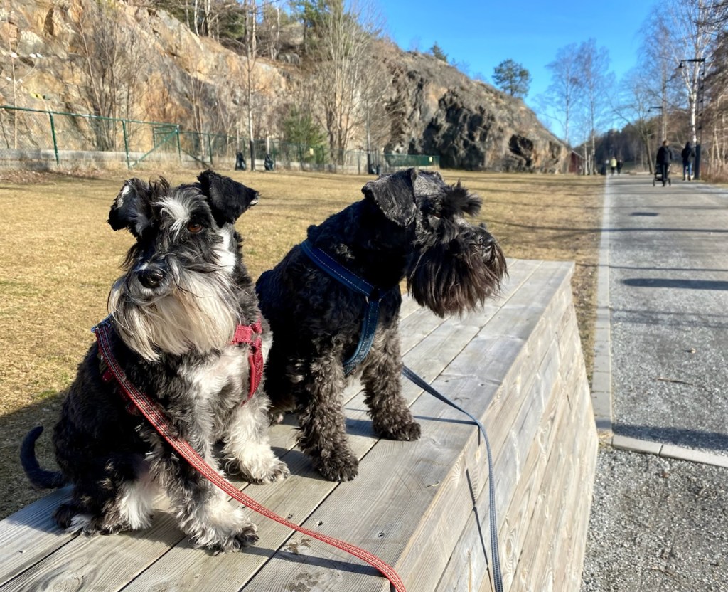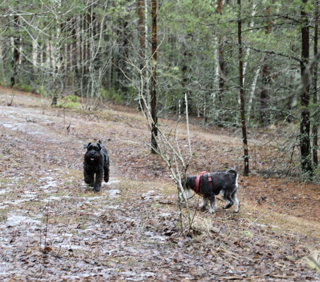 Nu känns det som liiite vår iallafall. Det blåser friska vårvindar i våra skägg och det är 5 grader varmt. Jag spanar in något lite längre bort. Stanna, sitt kvar säger matte och då gör vi det.