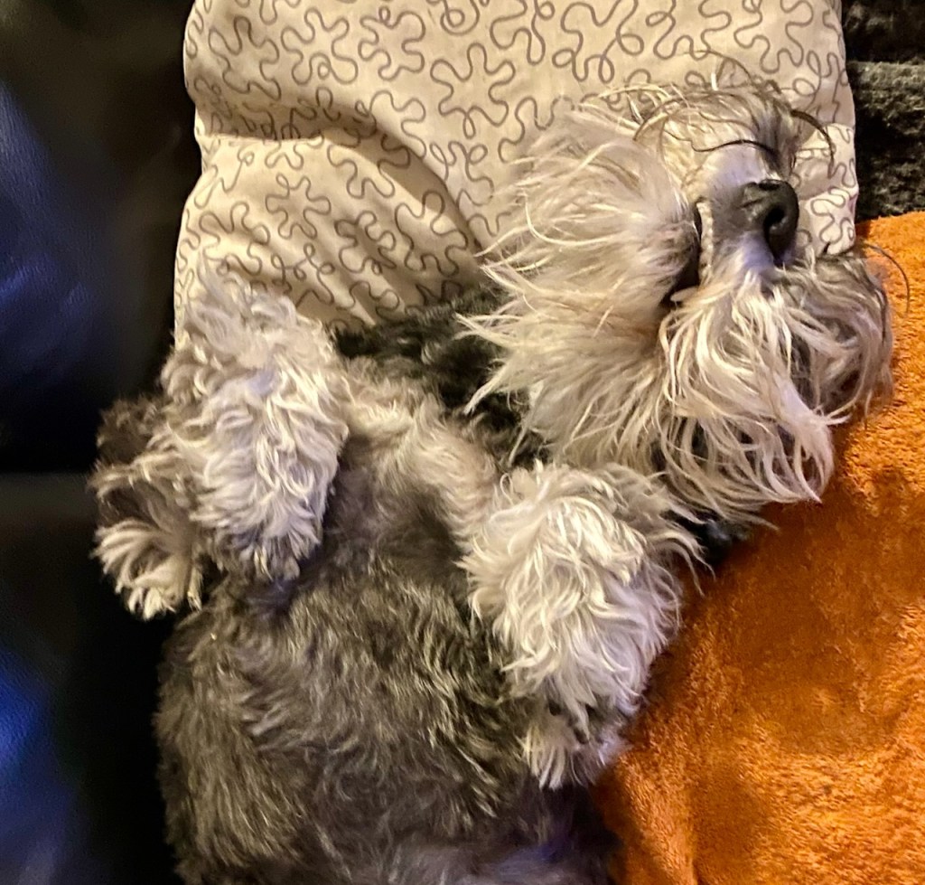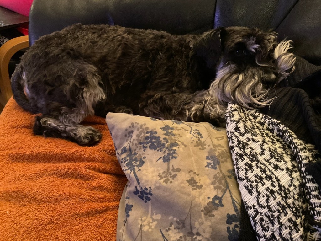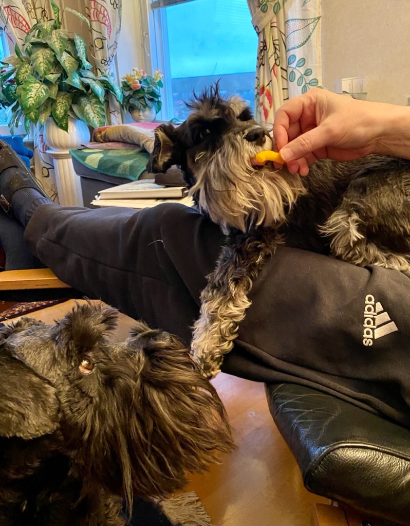Vilken härlig eftermiddag! Att få ligga i husses knä och bli bjuden på smaskiga ostbågar, det kan ju inte bli bättre. Vissa godsaker måste ätas med öppen mun för då smakar det underbart och kraschar så där härligt som bara godsaker kan. Troy håller noga koll på att vi får lika många. Många förresten …. de var alldeles för få om ni frågar mig.
