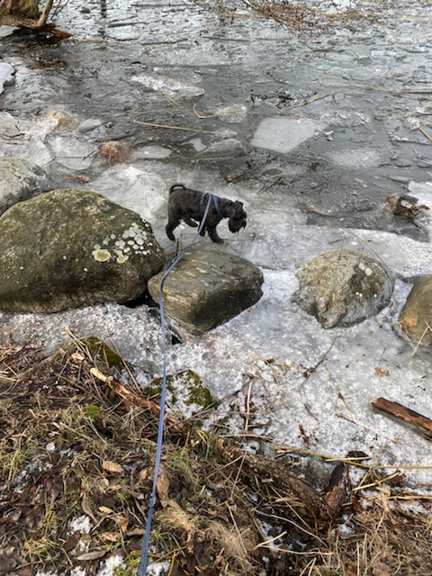 Matte gillar inte promenader på isen med han måste bara smaka på vattnet. Matte är beredd på att kunna dra upp honom om han plurrar. Nu gick det bra han fick blöta skägget och klarade sig upp på landbacken.