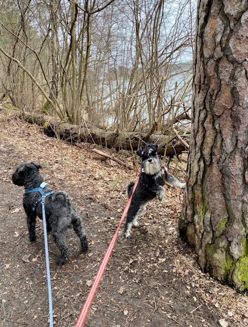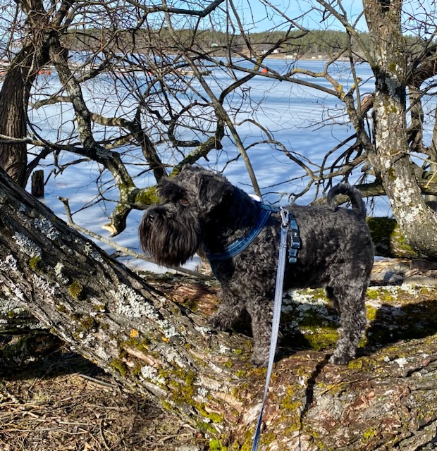 Ett härligt promenadväder, sol och flera grader varmt. Många omkullblåsta träd finns det och det är bra för då kan man hoppa upp på dem och få lite godis.