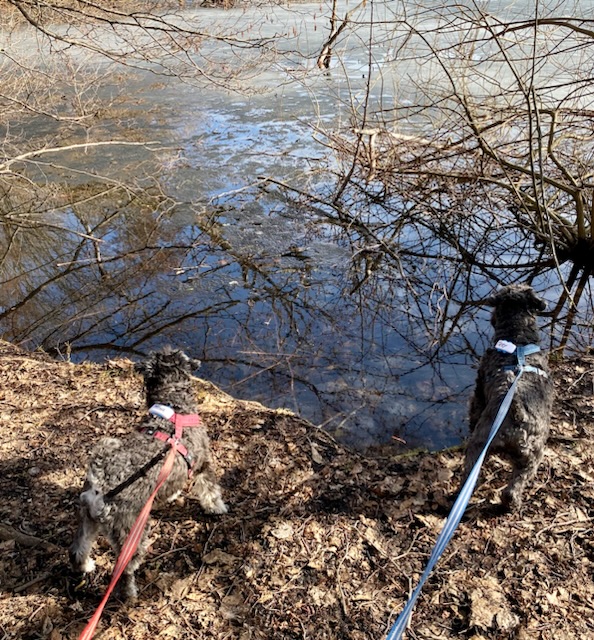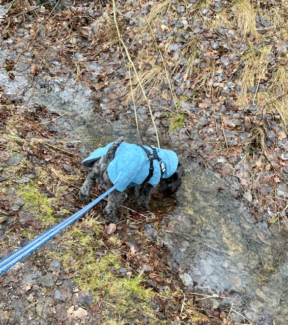 Troy fick gå i bäcken med smältvatten bara med framtassarna. Han provsmakande vattnet och det var gott. Men när han ville gå i för att plaska vart det stopp, det är fortfarande för kallt sa matte.