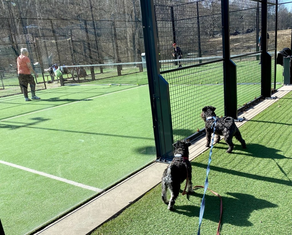 Det är inte lätt att få bolltokiga hundar att gå förbi en tennisbanan när de spelar paddel och många bollar är i luften. Vi följde noggrant spelet och vi hejade på tjejen närmast oss och som tack för det gav hon oss varsin tennisboll. Det finns fortfarande snälla människor.