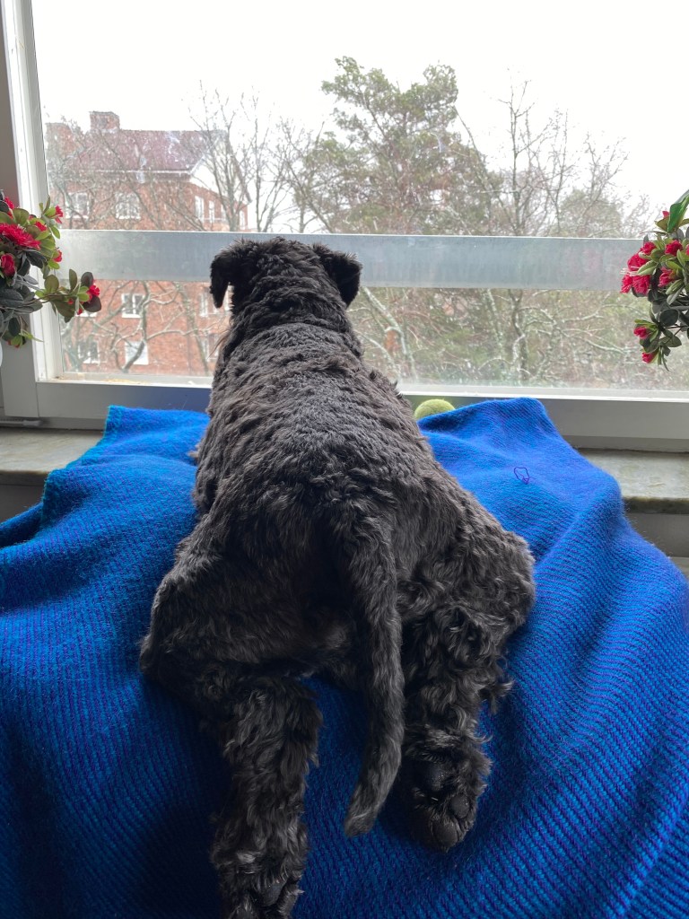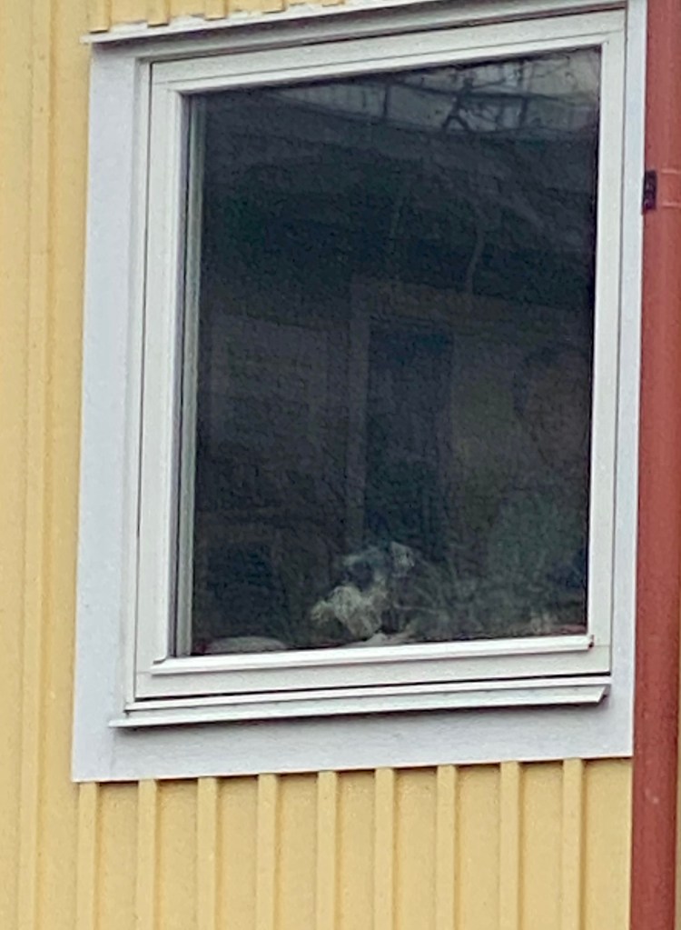 Kolla…. Kolla där ligger Kalle i sitt fönster och han har full span på vägen. När han ser mig börjar han ropa på mig så hans matte kommer till fönstret för att se vad som står på. Tyvärr blev bilden inget bra på min stiliga kavaljer.