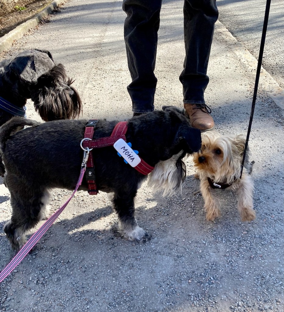 Plötsligt hör jag hur en vovve och hans husse ropar på mig. Men det är ju Morris sa jag till matte vi måste stanna. Vi gillar honom skarpt så vi hälsade på varandra och minglade en stund.