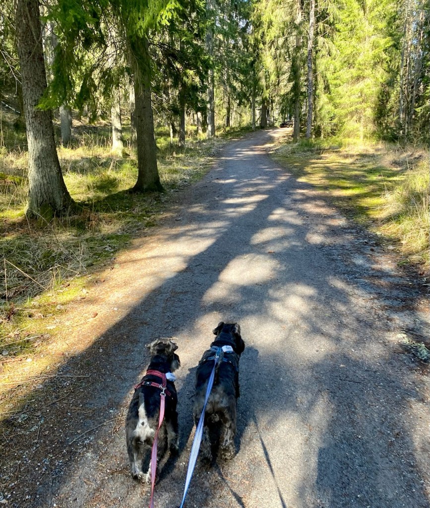 På väg genom skogen med en långsam matte. Vi skall till hundträffen och hon släpper inte oss fria innan Tommys gård kommer inom synhåll.