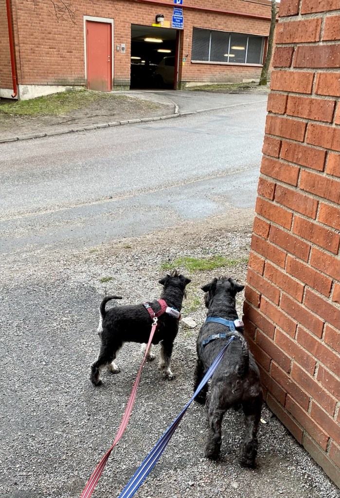 Nu har vi släpat ned en massa packning i källargången och sen försvinner husse in i garaget. Vi anar vad som är på G vi skall till vagnen. Men det är fasligt vilken tid det tar att hämta ut bilen.
