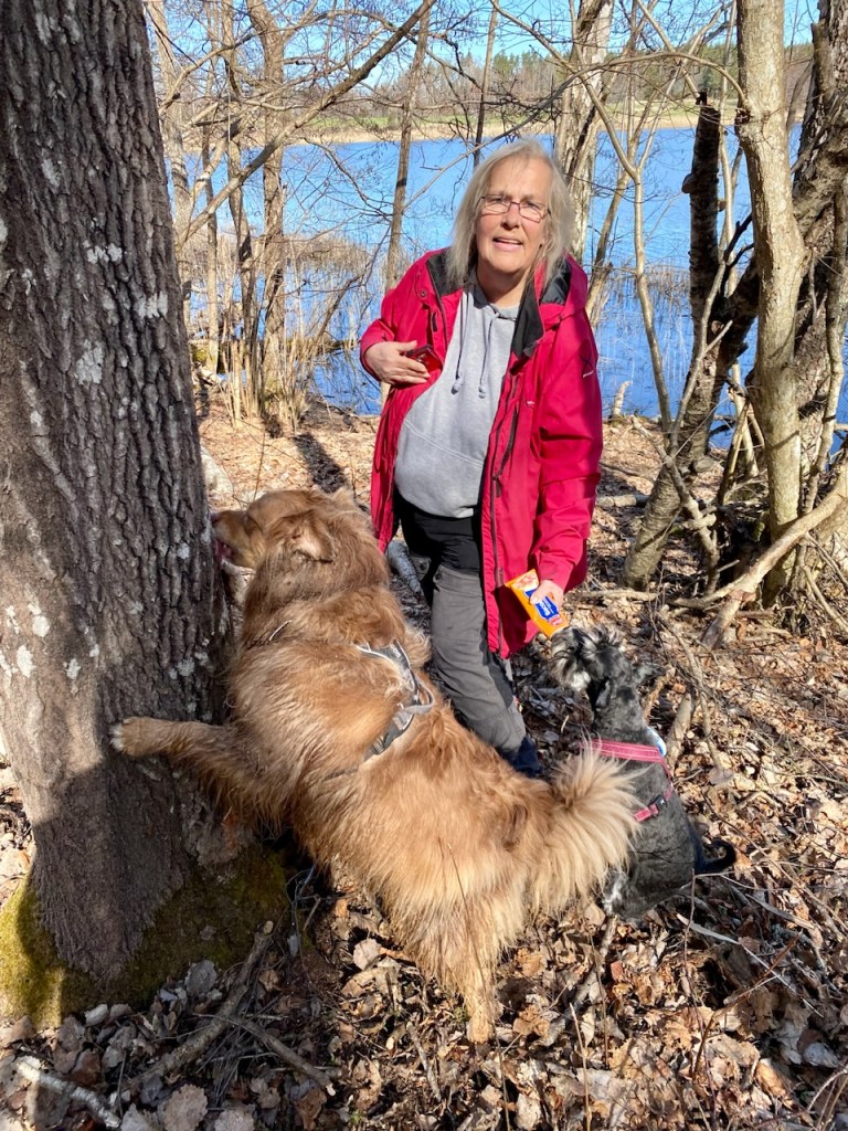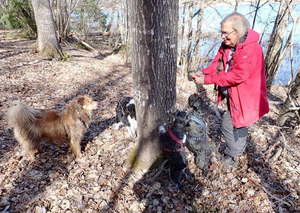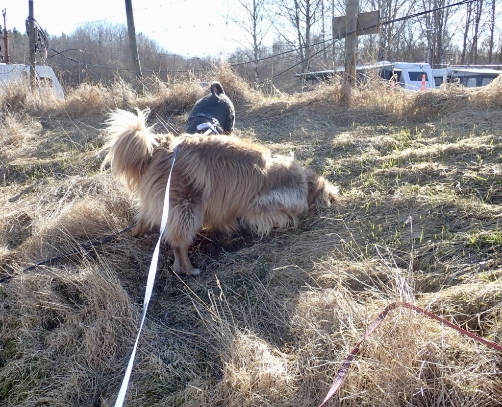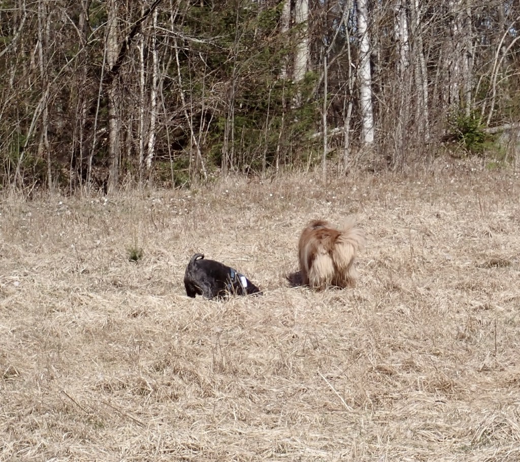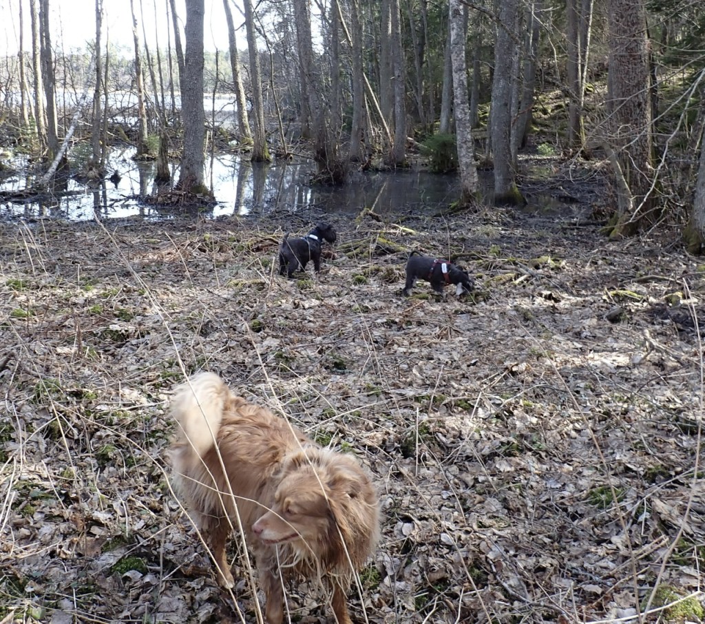 Troy och Basse är åter ifull färd med en gemensam sorkjakt. Basse gör sådana där rävhopp och Troy gräver. Jag orkar inte delta utan nöjer mig med att titta på. Wilma tycker att det räcker med skogsröj och börjar så sakteliga gå hemåt.