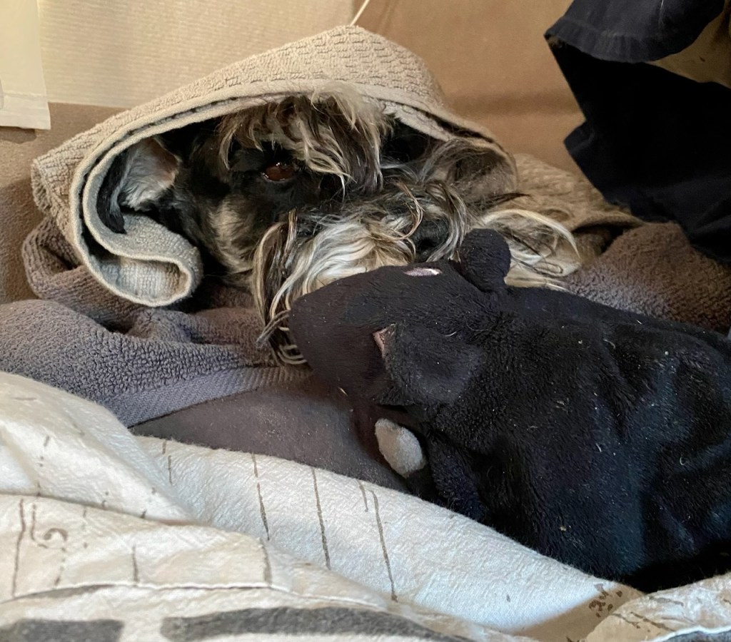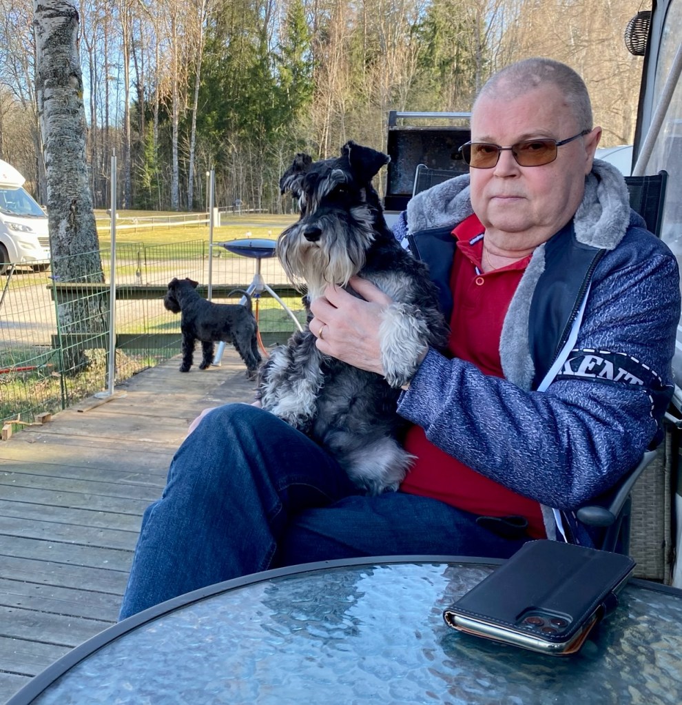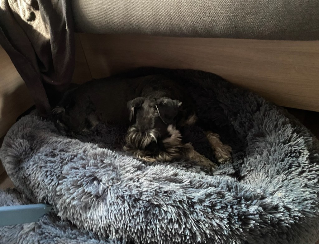 Hemma i vagnen kryper jag in under soffbordet där har jag en korg. Vi är båda jättetrötta efter tre timmars skogsröj så nu vill jag sova ostört. Zzzzzzz
