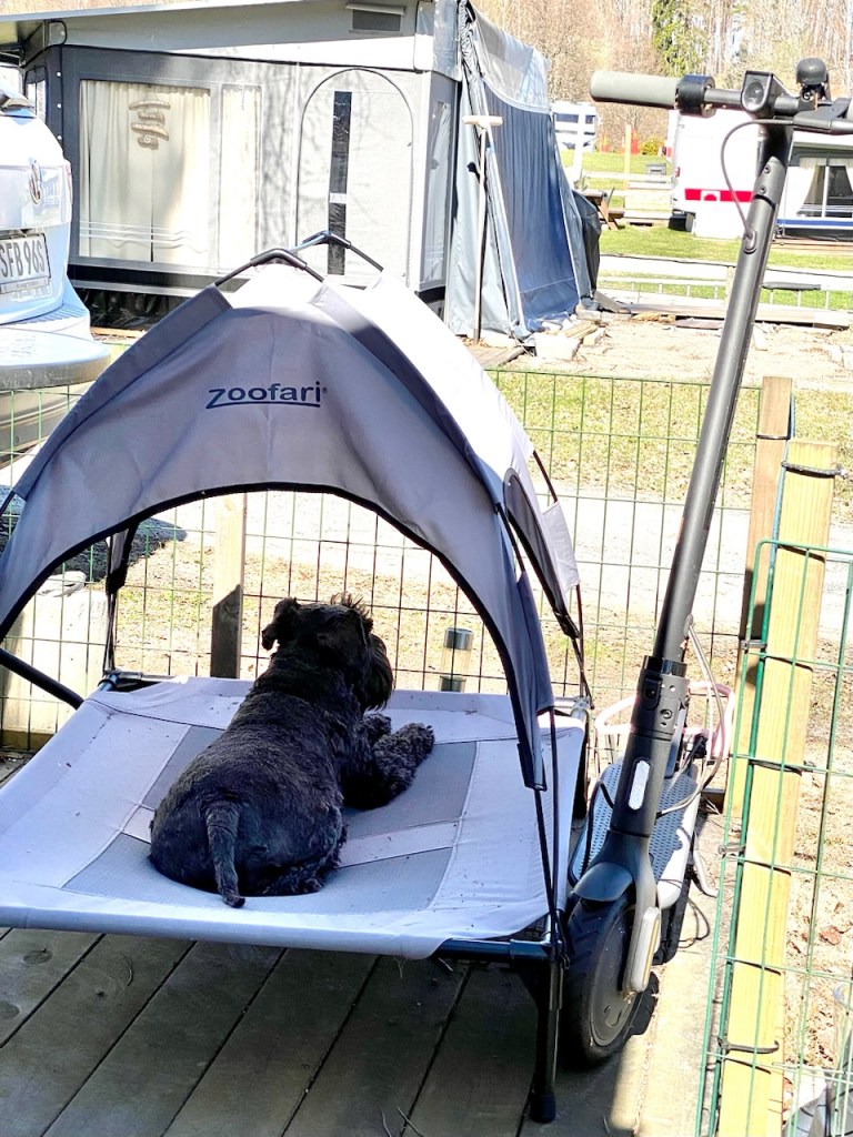 Matte har ställt fram Troys tältsäng. Han tycker om den och försitter inte tillfället att lägga sig i den. Jag tror att matte har slutat väsnas med lövblåsen så jag kan ta mig ut från förtältet där jag tog skydd.