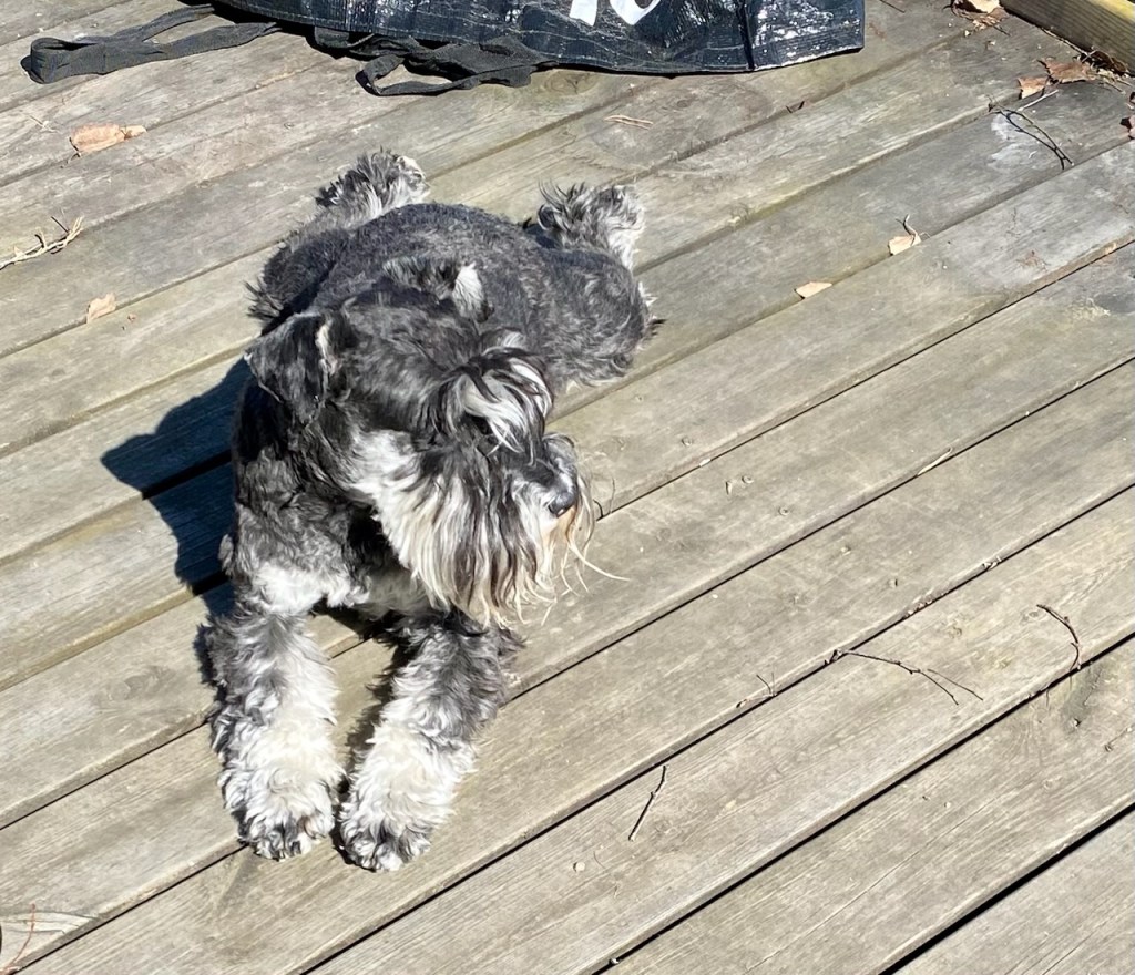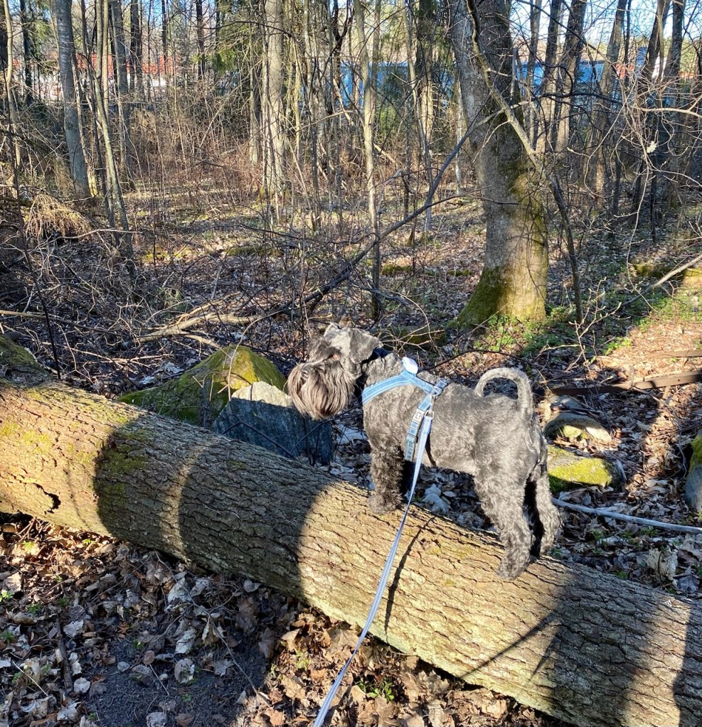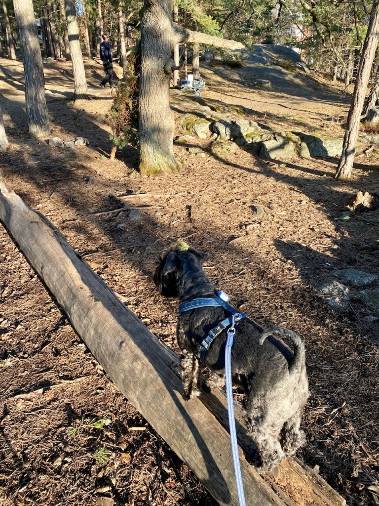 Troy gillar att gå balansgång och det går inte att gå förbi stocken. Ja jo matte uppmuntrar honom också.