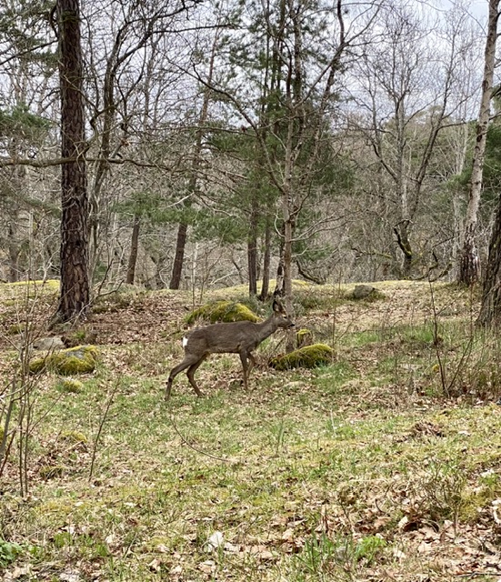 På baksidan av vårt hus går rådjur. På mattes uppmaning stod vi tysta och den stod kvar i godan ro och betade.