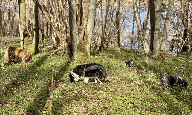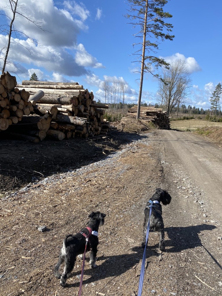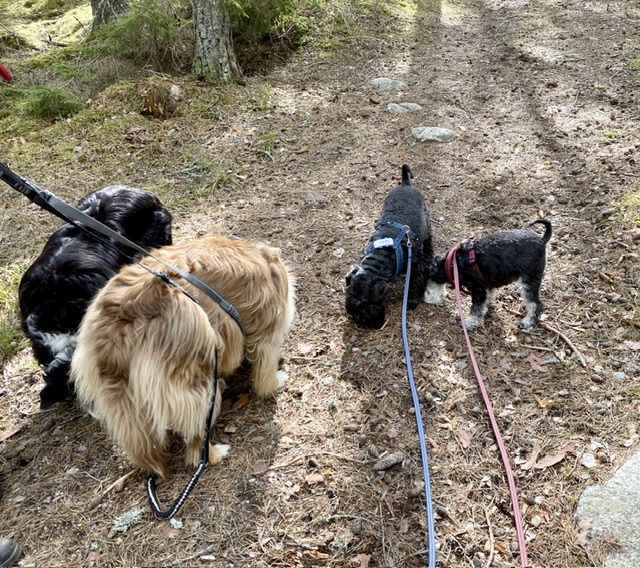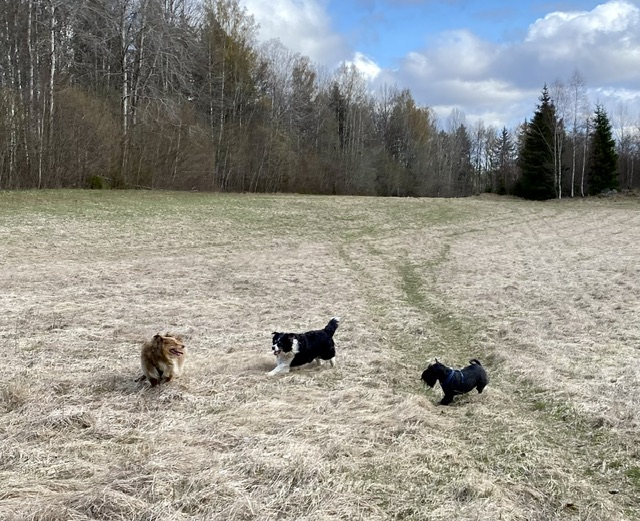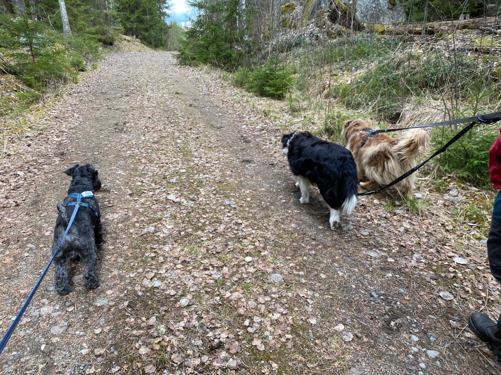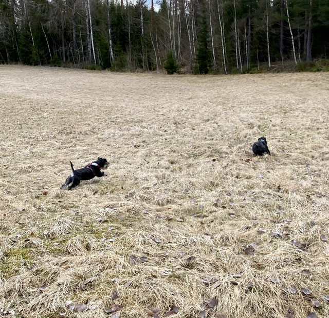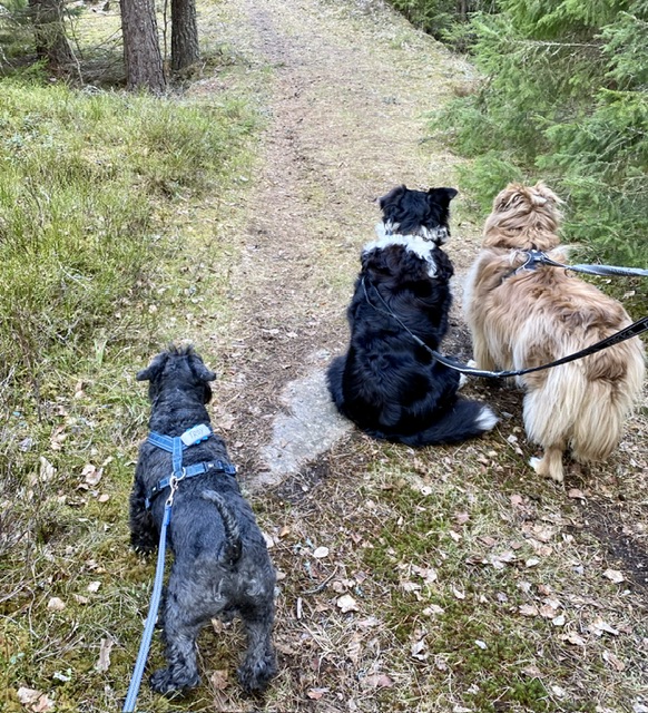 Nu nu är det spårning på gång. Matte har ett stadigt tag i kopplen och Helena försvinner bort i skogen. Vi hoppar och skuttar och tjuter av förväntning. Plötsligt släpper matte Wilma och sen mig. Vi springer på lätta steg och följer spårdoften. När vi kommit en bit kommer Troy loss och sätter väldig fart längs spåret strax därpå släpps även Basse.