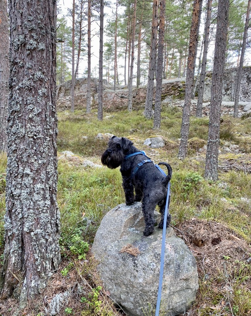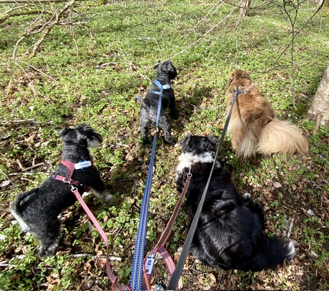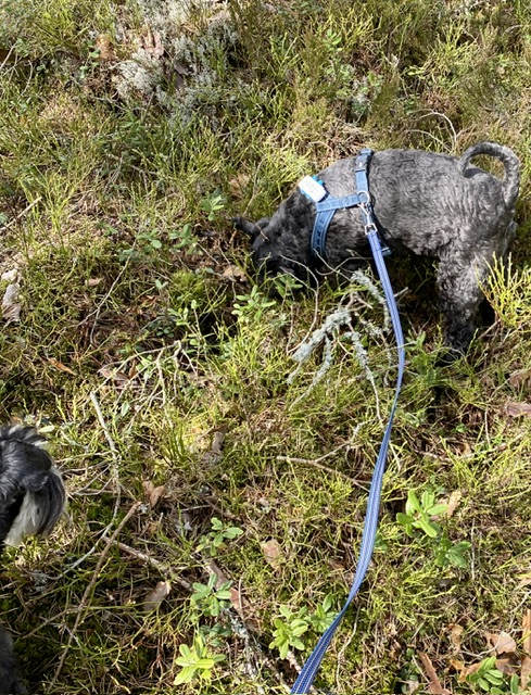 Mattarna har bestämt att det är koppel dom gäller i denna skog. Det har konstaterats att det finns två kanske fler stationära vargar. Ingen av oss protesterade och vi var alla vaksamma. Vi fortsätter promenaden och mattarna försöker hitta ruinen efter en fornborg som skall finnas här någonstans.