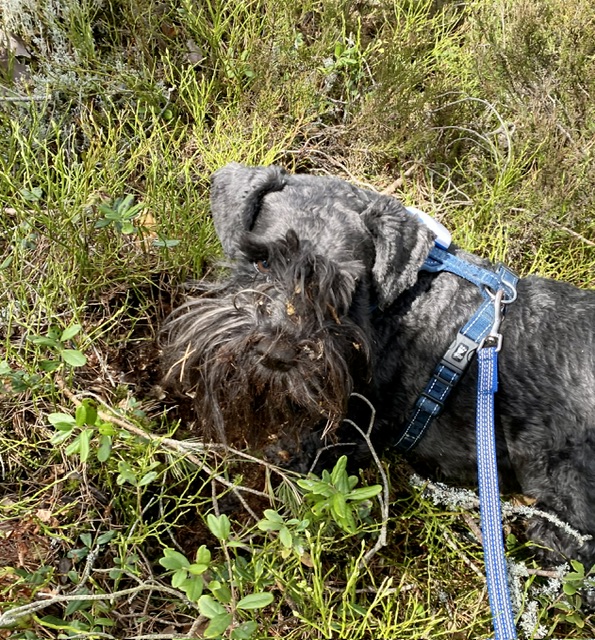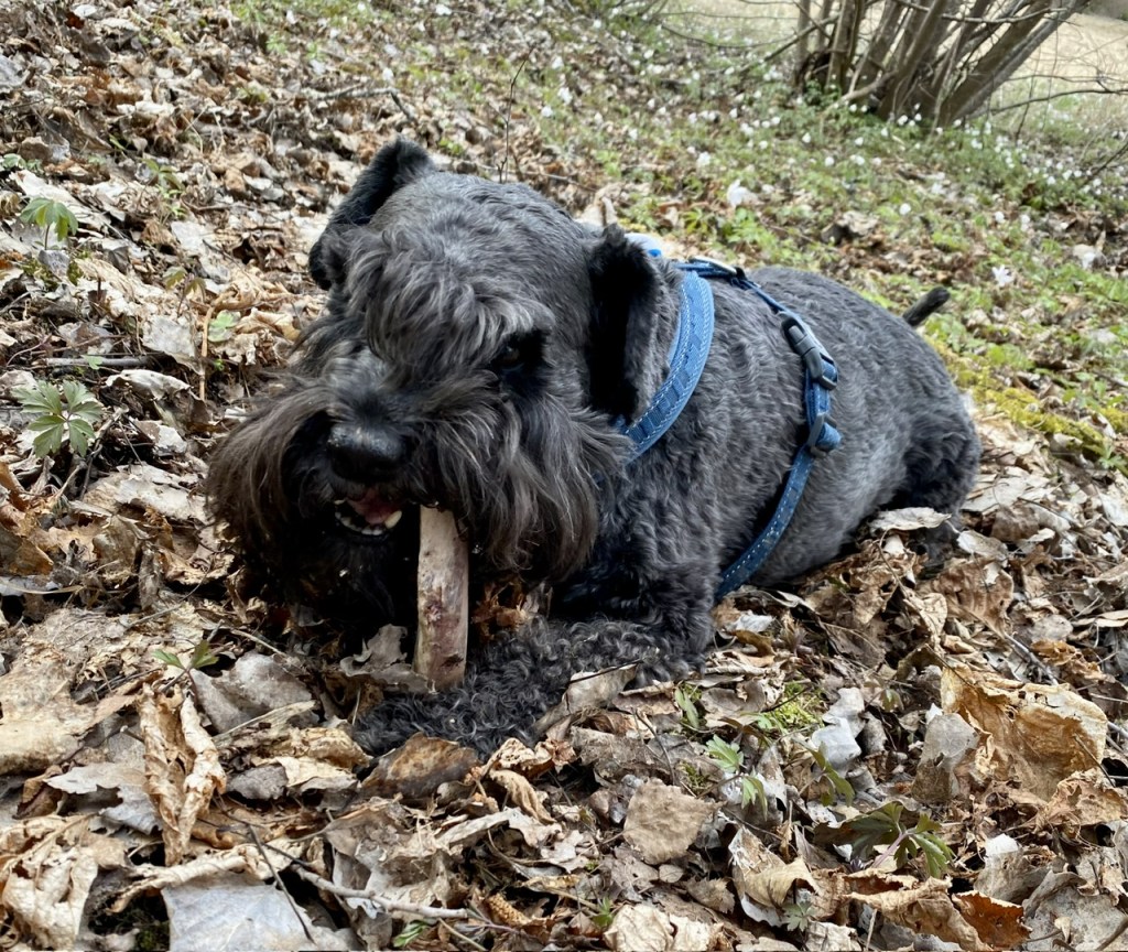 Nu är det dags att börja gå hemåt. Basse sticker iväg och hämtar ett ben som legat sen förra sommaren. Han ger Troy det som bestämmer sig för att stanna kvar en stund och gnaga på det. Alltså skogsmarinerade ben är supergott. När vi går vidare gömmer Troy benet.
