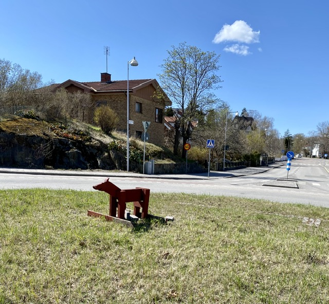 På nyheterna hörde vi att polisen jagade någon i en stulen hjullastare längs Hägerstensvägen. De hade kört rätt igenom rondellen vid Axelsberg. Jag sa till matte tror du rondellhunden klarade sig. Vi får gå dit och titta efter sa hon. Där var den den hade klarat sig.