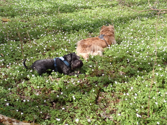 Det är mycket bättre med skogsturer än loppisar. Basse hämtade varsitt skogsmarinerat revben till sig och Troy. De lade sig bland vitsipporna och smaskade. Wilma tuggade på barken på en gammal gren och jag ägnade tiden åt att tigga godis.