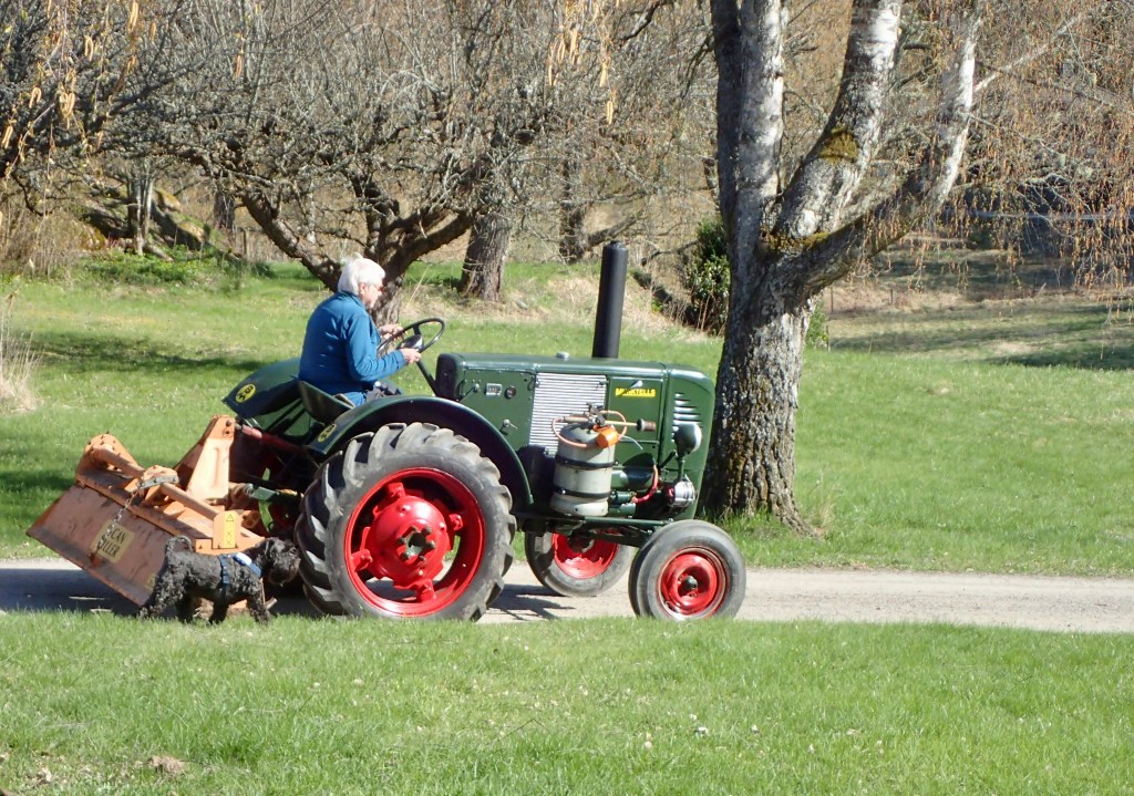 Vår matte är inte riktigt klok. Tommy frågade om hon ville ta chansen att köra runt en liten bit med hans gamla traktor. En med tändkulemotor tillverkad 1937 av Bolinder-Munktell. Ja vist sa hon glatt och iväg hon for. Troy och jag fick se till att inget hände med hennes så vi sprang på varsin sida om traktorn.