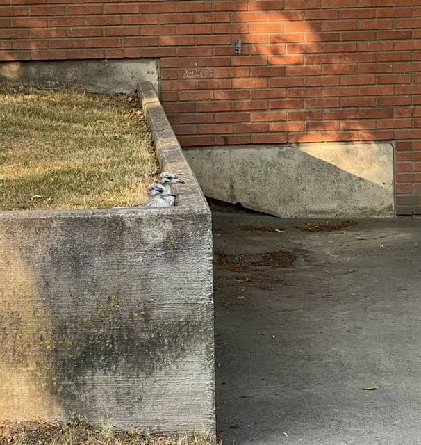 Nähä sa matte den vägen går vi inte. De två måsungarna som inte kan flyga än bevakas av två aggressiva föräldrar. Inte kul om de börjar anfalla.