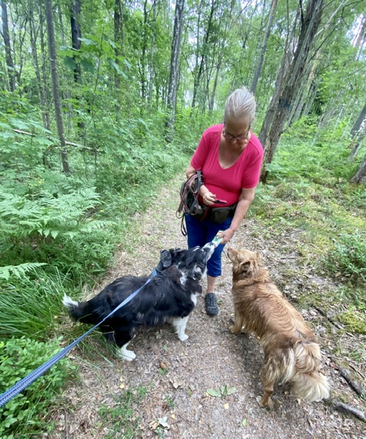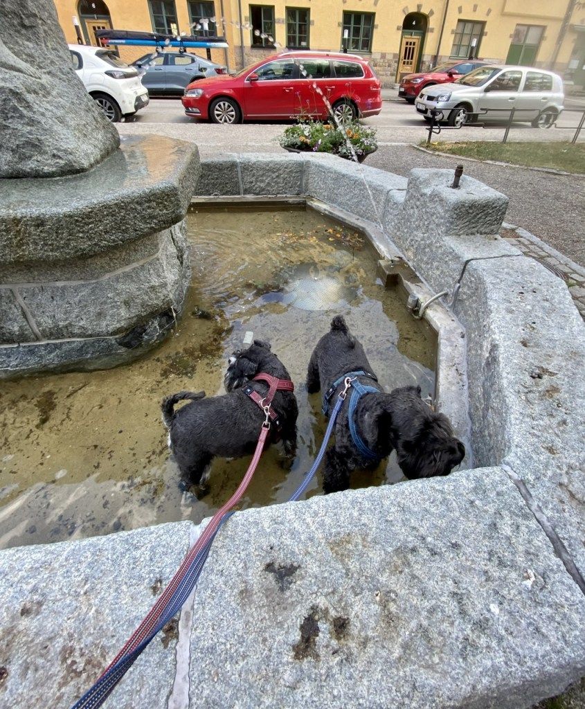 I sjöarna blommar de blågröna algerna för fullt så nu får inte bada eller dricka av sjövatten. Det är väldigt varmt även om vi försöker gå i skuggan så vi båda fick besöka fontänen och svalka av tassarna.