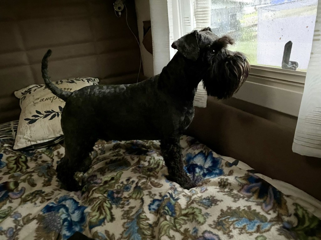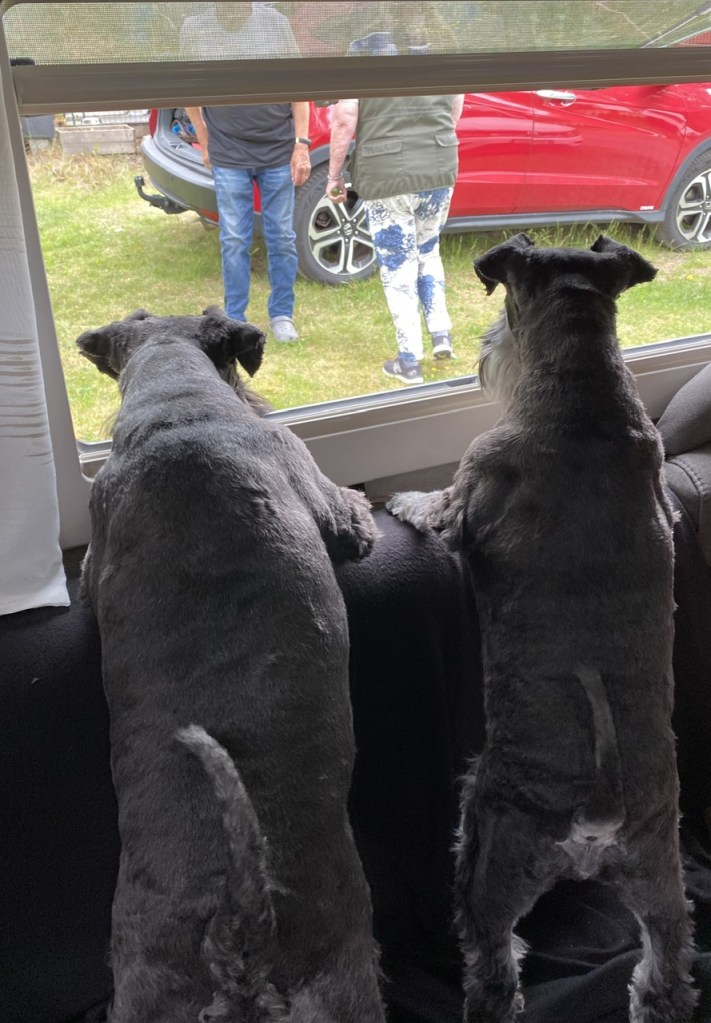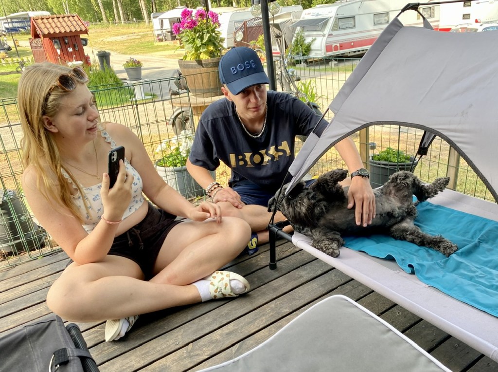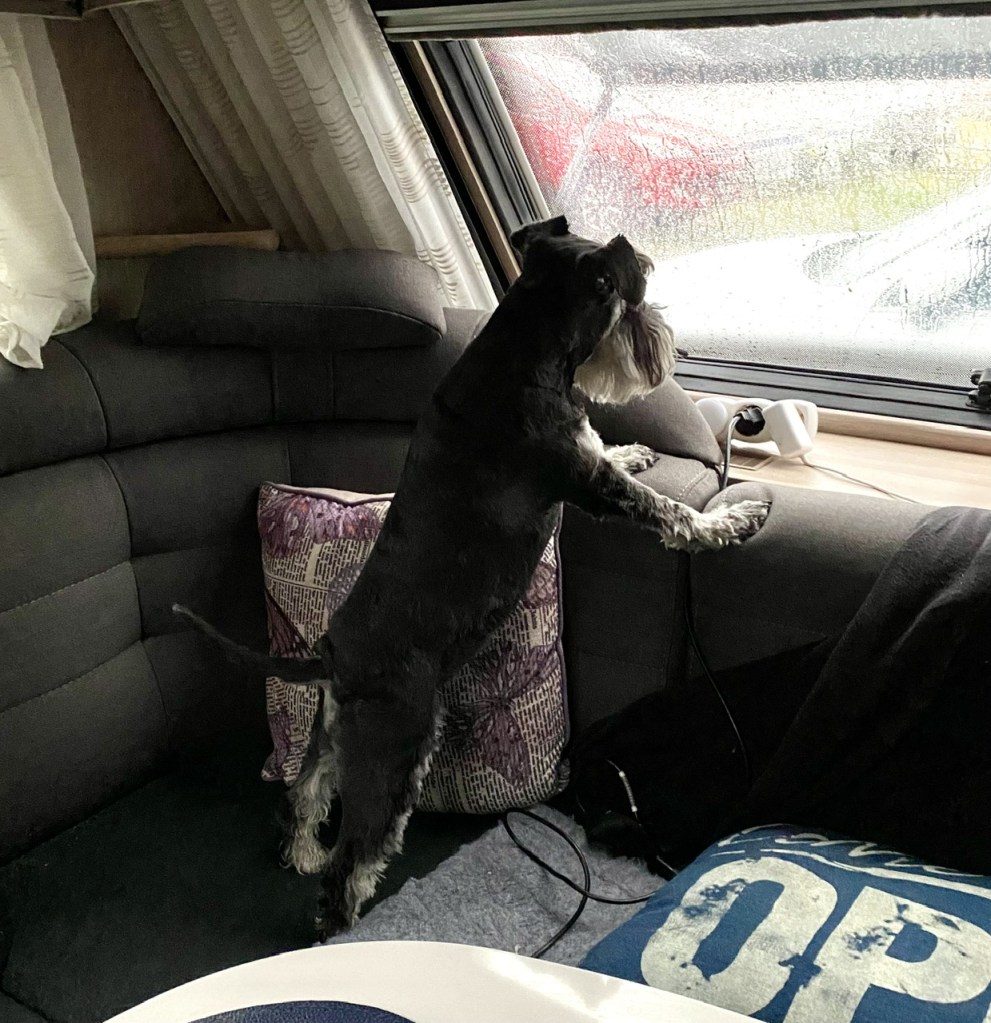 Matte det regnar! Matte husse försvan, var är han på väg. Jasså han skall till servicehuset för att duscha. Jag står här och håller koll så han inte går vilse bland vagnarna.