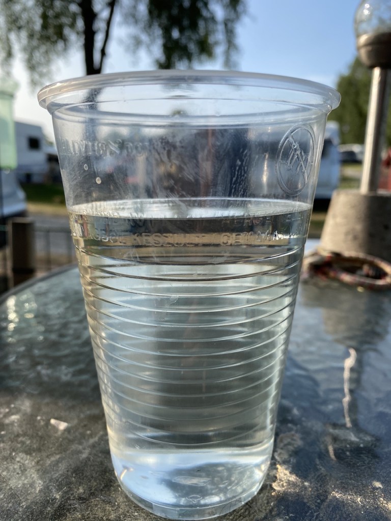 Tillbaka till campingen. Matte var och hämtade ett vattenprov från Hosjön. Tanken var att provet skulle stå i solen för att se om det börjar skimra. Inga alger kunde ses så troligen har regnet och blåsten gjort att de är borta.