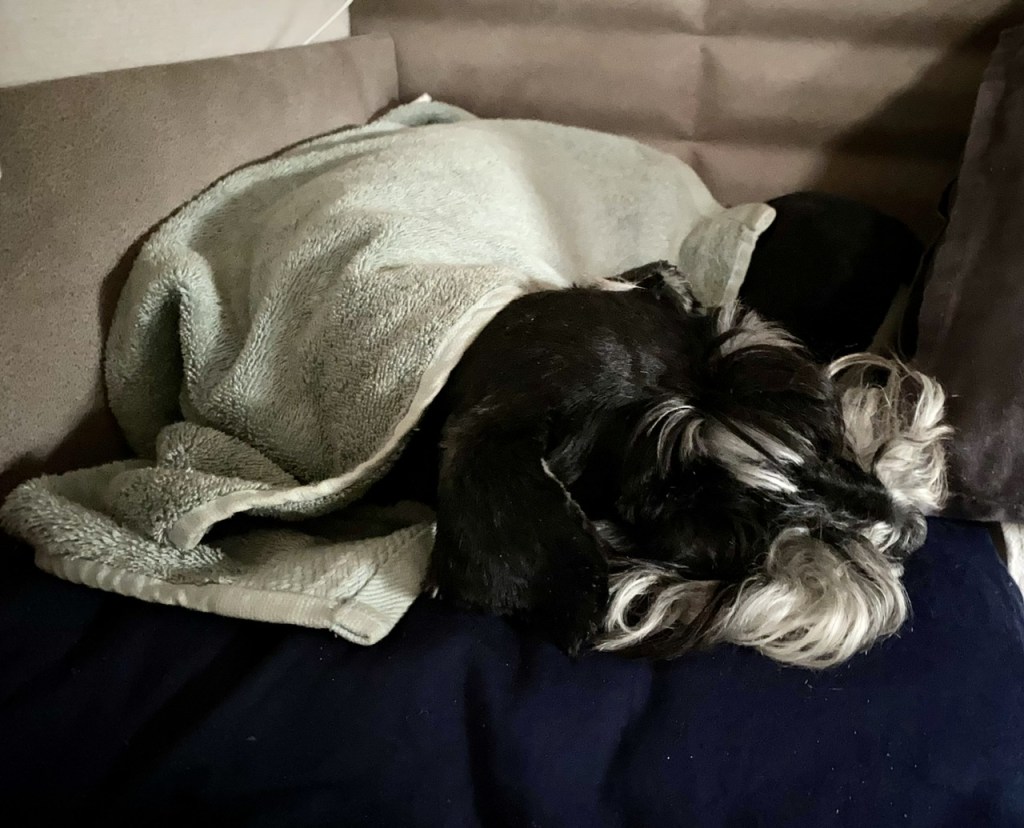 Jag har ingen annan åsikt sa Troy. Han brukar inte vilja ha någon filt på sig men nu mojsar han in sig i en på husses säng. Han kommer nog inte upp innan det vankas frukost.