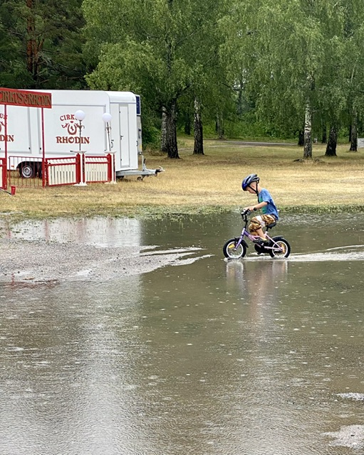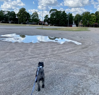 Barn/Hundar + vatten = sant. Helt obekymrad av regnet körde han var på varv på varv genom de stora vattenpölarna. Troy tittar intresserat på.