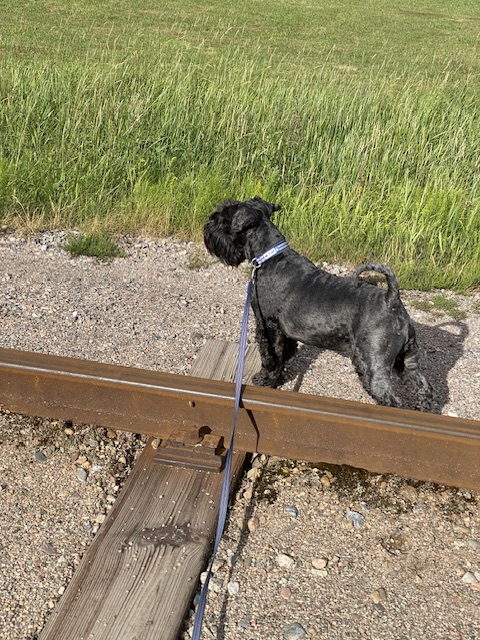 På ängen bakom spårvägen hoppar det runt flera kaniner. Matte håller hårt i kopplet. Tänk om vi kunde få jaga dem, bara lite alltså.