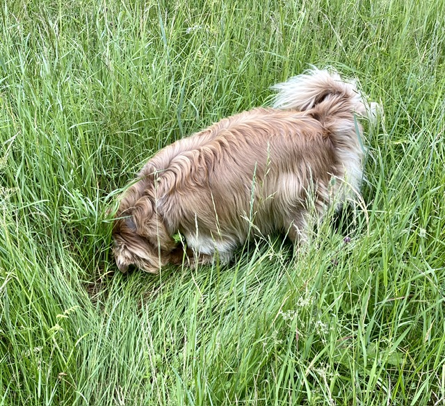 Basse hittade ett sorkhål mitt på ängen i det höga gräset. Men det var ingen hemma där. Det blev ingen lunchsork idag.