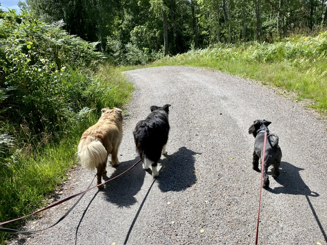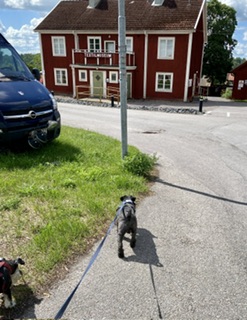 Troy tog täten på lördagens långpromenad. Han var mycket bestämd och målmedveten i vart han skulle. Matte sa, Troy….vart ska du? Han svarade inte utan fortsatte bestämt att visa vägen. Från campingen över Heden, till vänster bakom gamla macken. Fortsatte framåt och kom till en port, där stannade han och tyckte att matte skulle öppna den. Matte sa jag, jag tror att det är här Helena bor, jag skall kolla det sa hon och tog upp telefonen. Mycket riktigt, hon bor här. Varken Troy, matte eller jag har varit här tidigare så hur tusan hittade han hit! Ja sa jag, det är en hemlighet som bara vi hundar känner till. Tyvärr matte, jag kan inte avslöja hur vi gör, vår hundkodex förhindrar det.