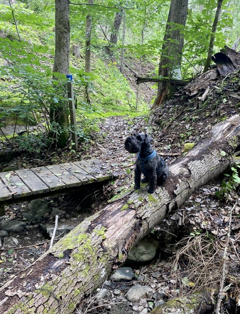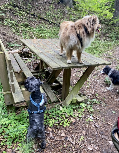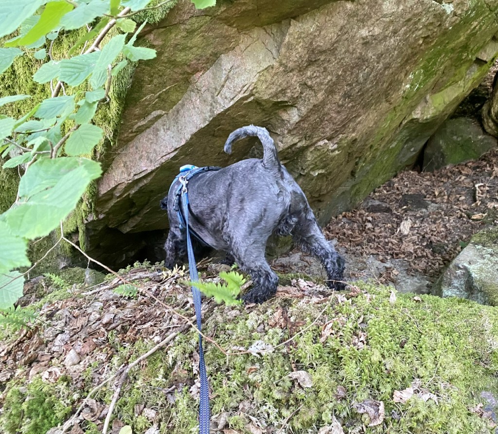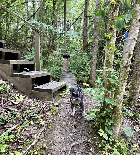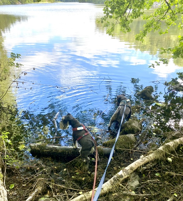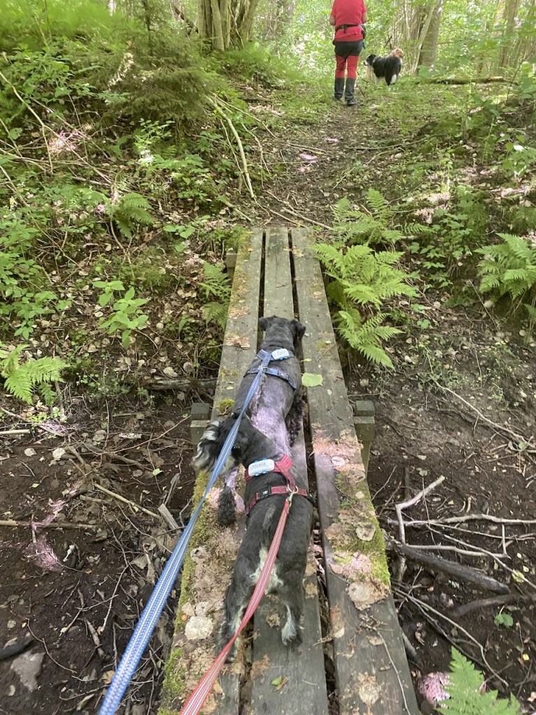 Eftersom vi är i vargskogen får vi inte vara på fria tassar men det var länge sen vi var här och då finns det mycket att kolla upp så det gör inget att vi måste vara kopplade. Det krävs koncentration när man skall gå på spänger särskilt när några är murkna.