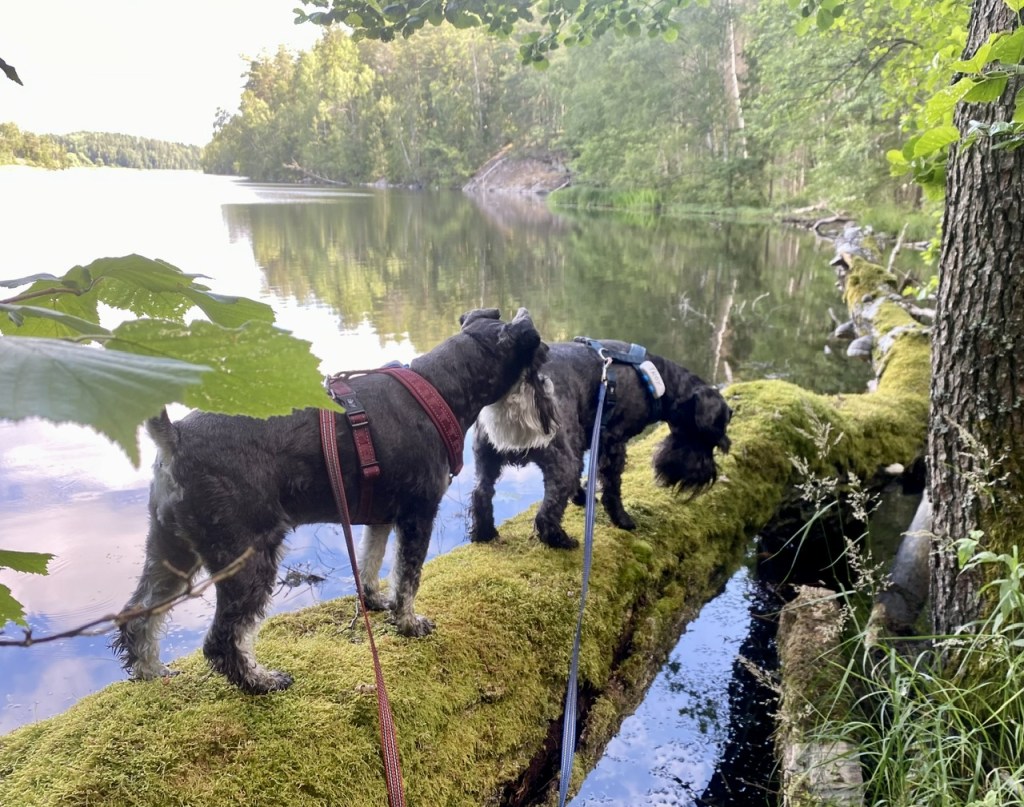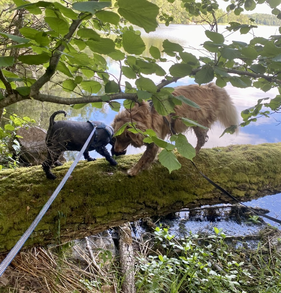 Sen skulle Basse också ut på trädet och då hänger Troy på ett varv till. Det blev det lite knepigt när de skulle mötas på stocken. Allt gick bra, ingen drattade ner i vattnet.