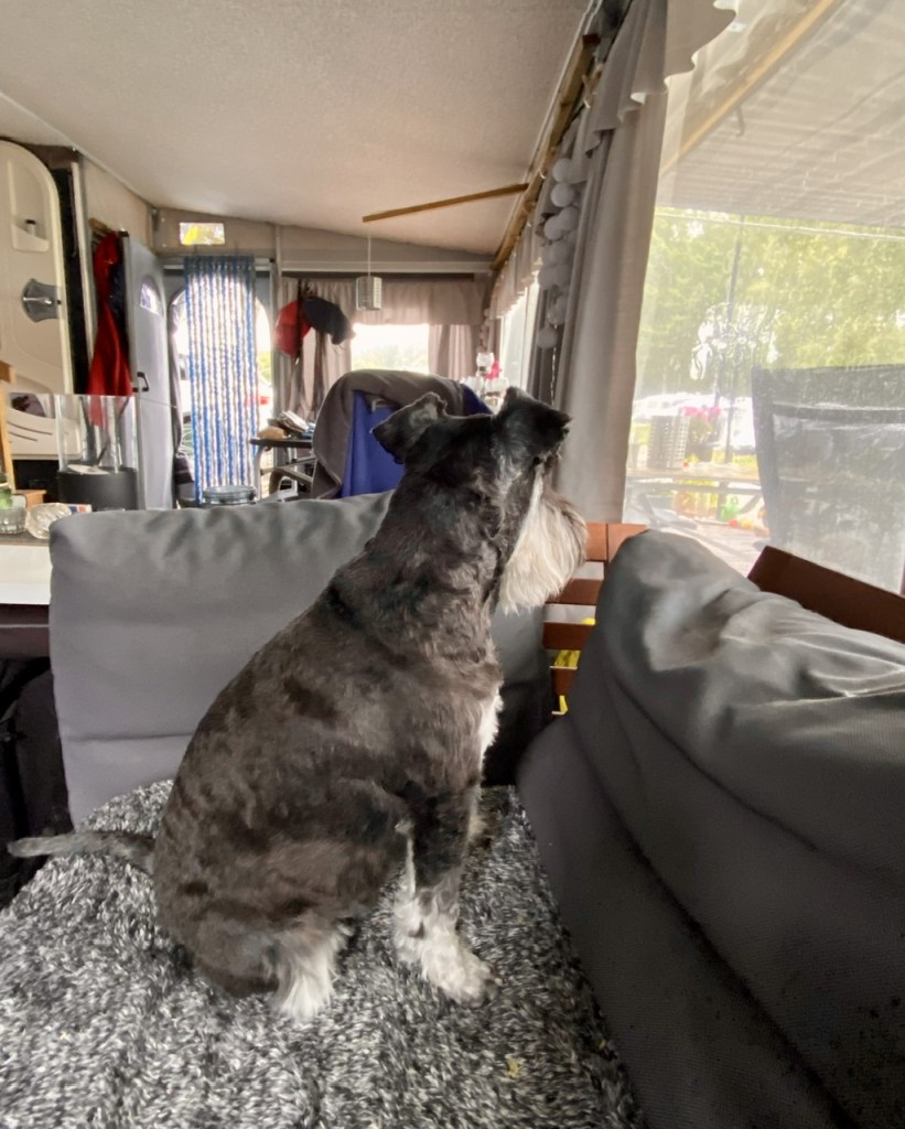 Vi satte oss på framsätet mellan matte och Tommy. Det är underbart med vinden i skägget. Vi njuter av åkturen som går i en lagom fart.